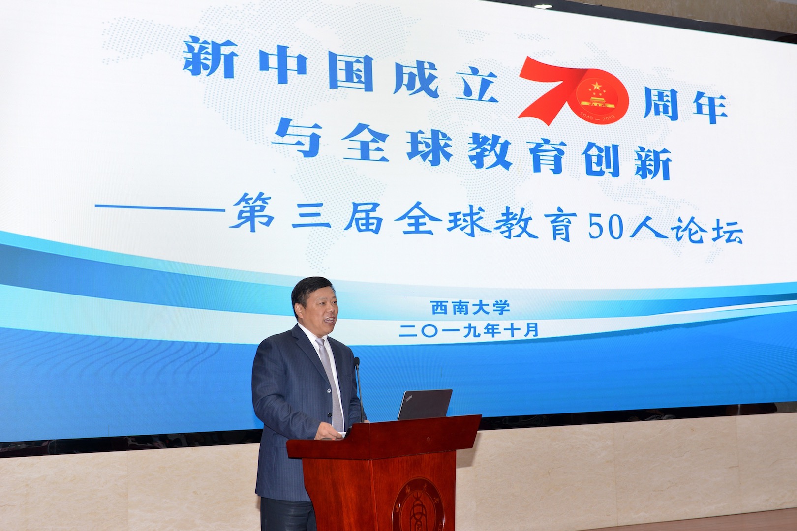为庆祝新中国成立70周年,总结中国教育发展的经验,探索全球教育创新,展望全球教育发展动态,10月19日,第三届全球教育50人论坛在校举行。本届论坛以“全球教育创新暨2035、2050教育展望”为主题,由西南大学、全球教育50人论坛和清华大学民生经济研究院主办,清华大学当代中国研究中心、清华大学社会与金融研究中心、西南财经大学资本市场研究院和小平故里书院协办。