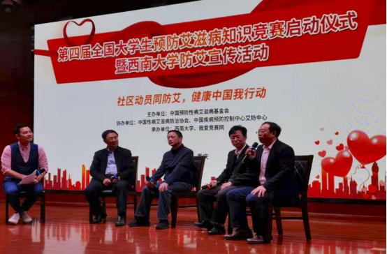 教育部体育卫生与艺术教育司原副司长廖文科巡视员、中国预防性病艾滋病基金会理事长孙新华、中国预防性病艾滋病基金会代理秘书长刘小平、中国疾病预防控制中心艾滋病首席专家邵一鸣教授、西南大学副校长崔延强,以及重庆市教委体育卫生艺术教育、卫健委疾病预防控制处、北碚区卫生健康委、北碚区疾控中心、西南大学校医院等单位相关负责人上台,共同按下启动屏,全国大学生预防艾滋病知识竞赛正式启动。