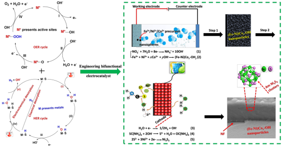 析氢(HER)、析氧(OER)电极材料是构成电催化水解器的核心要素,开发低成本、高活性、高稳定性的双功能催化材料是目前世界级的挑战,基于HER和OER催化循环机理,其活性位不相容,单一的析氢、析氧催化剂的混合会导致活性中心的大面积相互覆盖,使得活性反而次于单一组分。因此,如何设计高活性、高稳定性的廉价材料成为棘手的关键。课题组前期为此精巧设计了基于一步电子诱导共沉积机理的原子级别(Ni-Fe)Sx/NiFe(OH)y复合催化材料,在准工业环境测试下,可以实现大电流密度超高效、稳定的水解,有望实现工业化大规模生产。为了更进一步地提升水解-氢能转换效率,降低整个水解过电位。课题组又进一步设计了非晶态(Fe-Ni)Cox-OH/Ni3S2纳米复合催化电极材料,巧妙地调控Ni3S2为非晶态,同时引入纳米裂缝和界面效应,使(Fe-Ni)Cox-OH纳米薄膜完全暴露于电解质中,该双功能材料实现了超高效的水解,可作为商业规模化运用的优选材料。进一步的DFT计算表明非晶Ni3S2活性>缺陷型>结晶型,本文工作为其他类型的复合材料设计提供了基础指南。