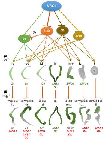 此外,该团队在本研究中分离鉴定了三个隐性等位突变体nsg1-1,nsg1-2和nsg1-3,其小穗除雌蕊发育正常外,所有的侧生器官(特别是两个护颖)出现不同程度的外稃化。通过遗传学、细胞学和分子生物学等手段,团队深度揭示了NSG1基因编码的C2H2锌指结构转录因子可以通过与水稻TPR类转录共抑制子结合,进一步募集组蛋白去乙酰化酶HDAC去直接抑制LHS1/OsMADS1(一个水稻外稃及内稃主体特征发育基因)在护颖等侧生器官中的异位表达,从而维持这些器官的正常发育。该研究一方面阐明了水稻小穗中护颖等颖片类侧生器官区别于外稃发育的分子机制,另一方面也为“三花小穗”分子设计育种途径提供了新的基因资源,具有重要意义。