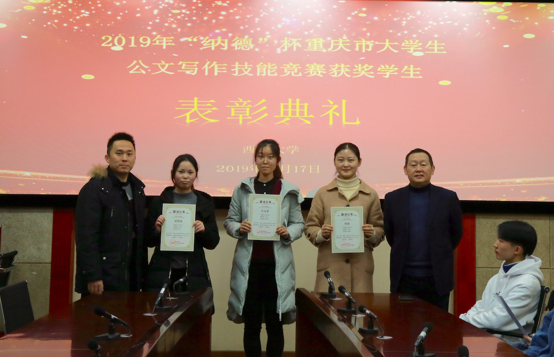 第四届“纳德杯”大学生公文写作技能竞赛在重庆科技学院举行,来自重庆市内外71所高校的1372名学生参加竞赛。西南大学学子沉着应战,稳定发挥。经过现场比拼,学校学子在中文组个人赛中9人获一等奖,5人获二等奖,4人获三等奖。外国语学院2017级杨情节斩获全市第一名;在英文组个人赛中4人获一等奖,4人获二等奖,4人获三等奖。中文组、英文组均位于奖牌榜榜首。