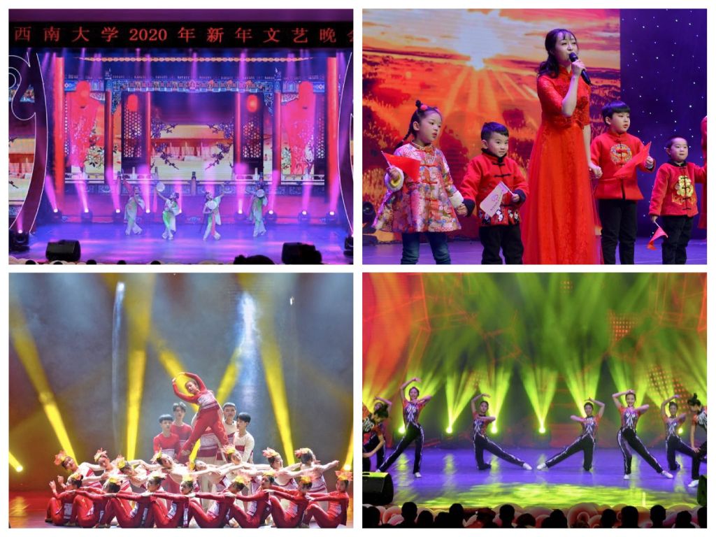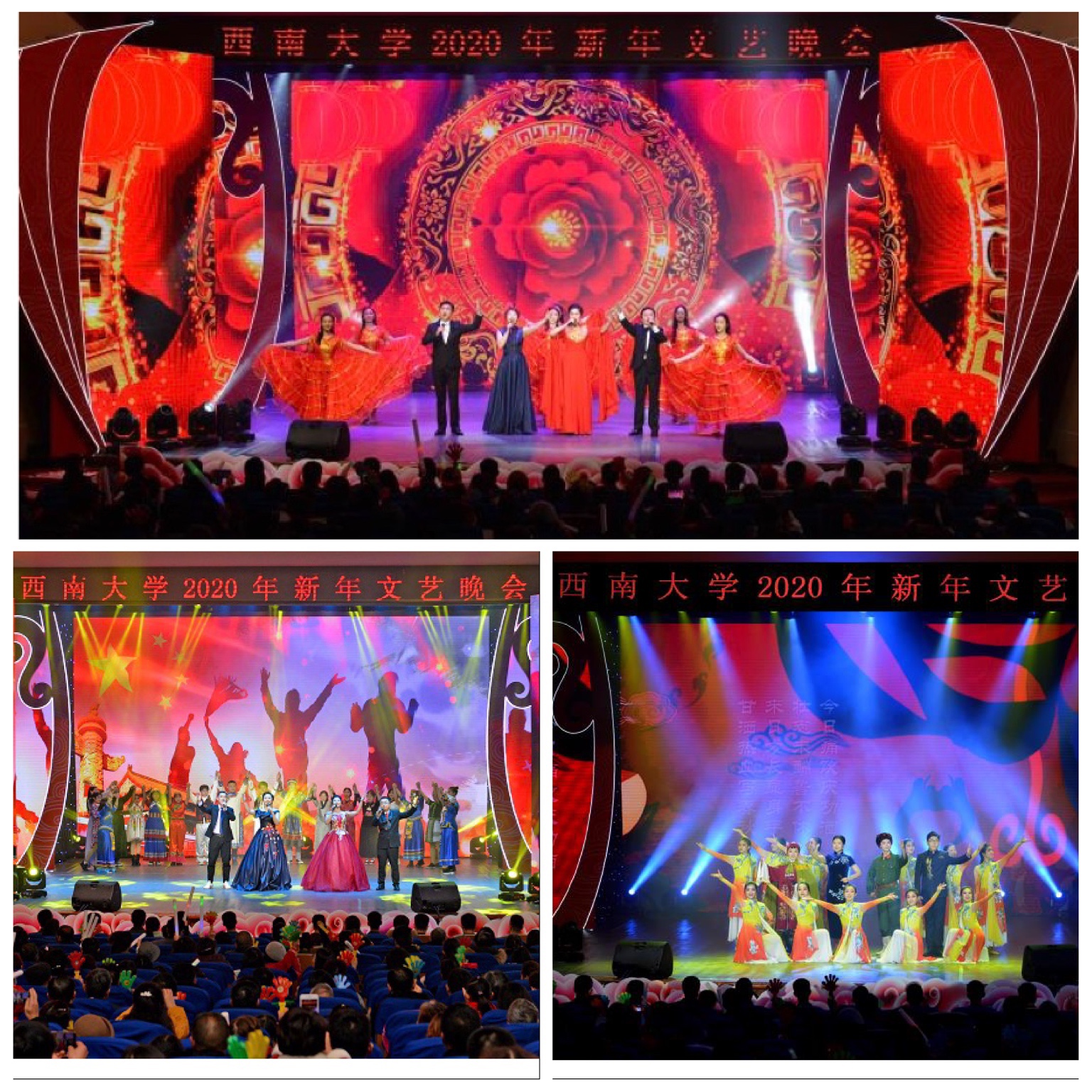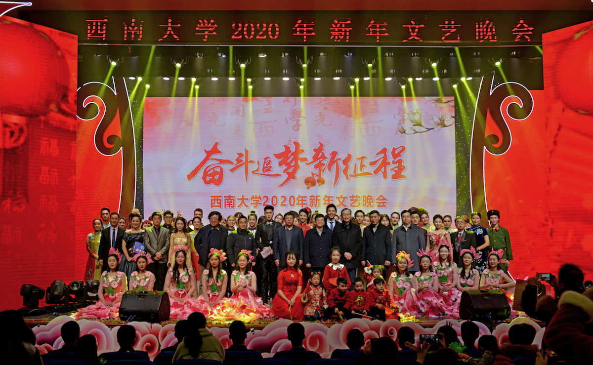 音乐学院师生歌舞《奋进之春》,踩着奋进的鼓点和追梦的步伐拉开了晚会序幕,展现了西大人的昂扬斗志。伴随开场歌舞渲染的欢快氛围,李旭锋书记,张卫国校长献上新年祝福,袁隆平、李丹阳等来自全球各地西大校友的新年祝福令全场观众心潮澎湃。晚会播放的《不忘初心,砥砺奋进——西南大学2019年党的建设与事业发展回眸》专题片回顾了学校在党建工作、人才培养、学科科研、社会服务、国际化办学、校园文化、基础建设等多方面取得的喜人成绩。