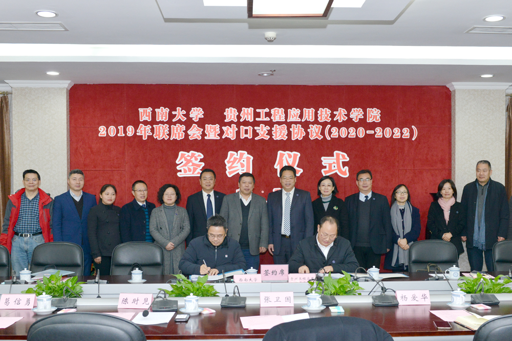 12月27日,学校与贵州工程应用技术学院2019年联席会暨对口支援协议签约仪式举行。我校校长张卫国、副校长陈时见,贵州工程应用技术学院校长王建平、副校长向贤礼,以及双方相关部门领导参加会议。会议由陈时见副校长主持。