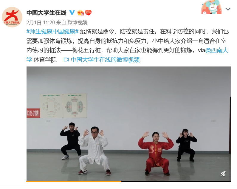 在全国人民贯彻落实党中央决策部署,众志成城战疫情、同舟共济克时艰之际,西南大学体育学院通过学院微信公众号发布《习梅花五行桩强健体魄 更好抵御新型冠状病毒》,向学校师生及社会推广了一套适合在室内练习的健身操——“梅花五行桩”。通过视频教程及文字介绍,教大家在家隔离的同时,积极锻炼,科学防控疫情。
