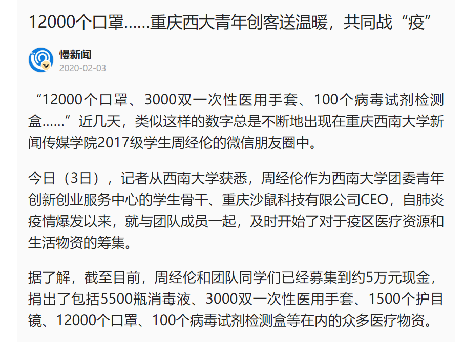 【疫情防控系列报道之三十六】外媒报道:重庆西大青年创客送温暖,共同战“疫”