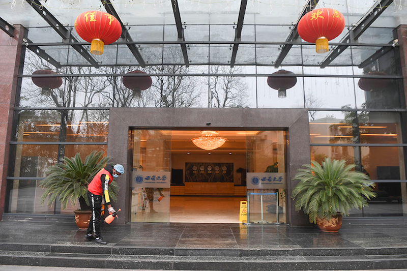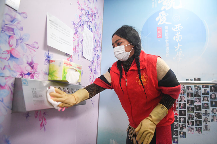 2月18日,西南大学一名留学生志愿者在学生公寓门口进行消毒。