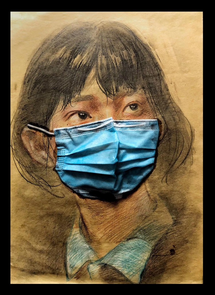 近日,西南大学美术学院本科2018级雕塑专业学生刘昱伽在家中拿起画笔,利用废弃口罩、旧抹布、旧报纸、包装袋等材料,创作出了一幅幅感人的画作。