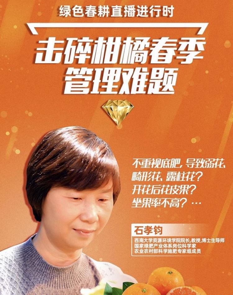 “不重视底肥,就容易导致柑橘出现畸形花,坐果率不高。”3月3日,西南大学资源环境学院院长石孝均教授变身“主播”,面向全国各地的柑橘种植户线上直播讲解施肥技术。石孝均说,柑橘的春季管理是柑橘种植的难题,希望通过线上直播让农户足不出户也能学习到施肥管护要点,帮助他们增收致富。