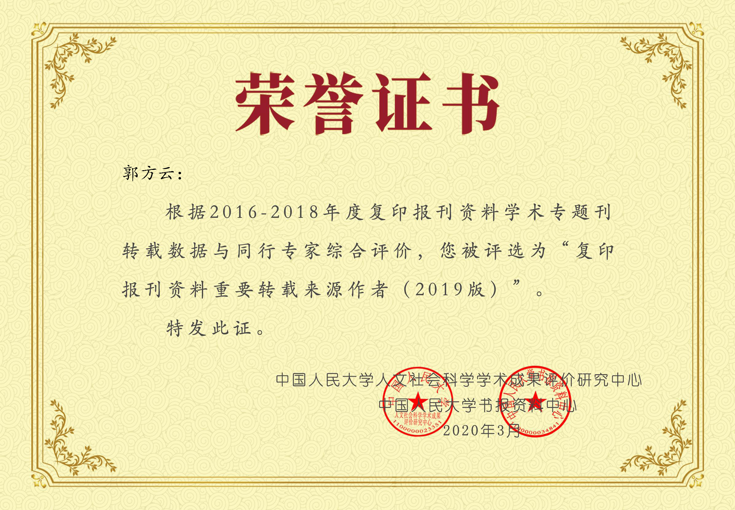 学校郭方云教授喜获人大“复印报刊资料重要转载来源作者”称号