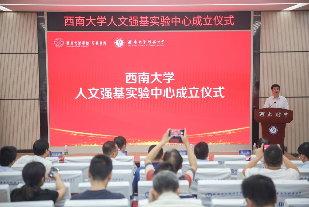 潘洵宣读《西南大学关于设立人文强基实验中心的决定》,并向中心各基地校授牌。