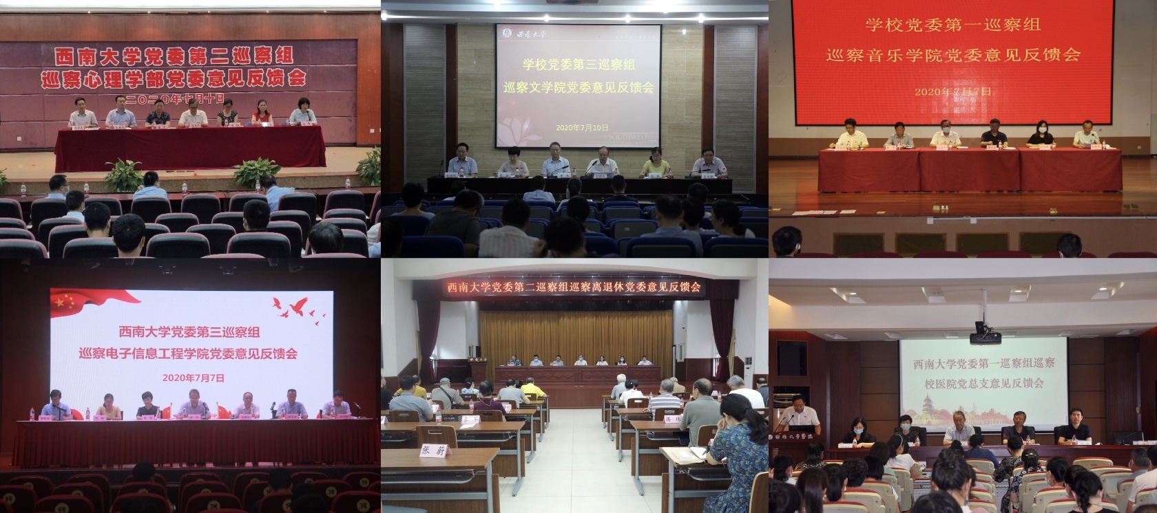 7月7日至10日,党委巡察组巡察心理学部党委、文学院党委、音乐学院党委、电子信息工程学院党委、离退休党委、校医院党总支意见反馈会先后召开。党委副书记、巡察工作领导小组副组长安春元、党委副书记、纪委书记、巡察工作领导小组副组长李华出席有关单位反馈会,传达学校党委对巡察整改工作的要求并讲话。第一巡察组组长周文全、第二巡察组组长李红、第三巡察组组长刘建长分别反馈巡察意见,被巡察单位党组织书记作表态发言。反馈会前,巡察组向被巡察单位领导班子进行了情况反馈和沟通交流。