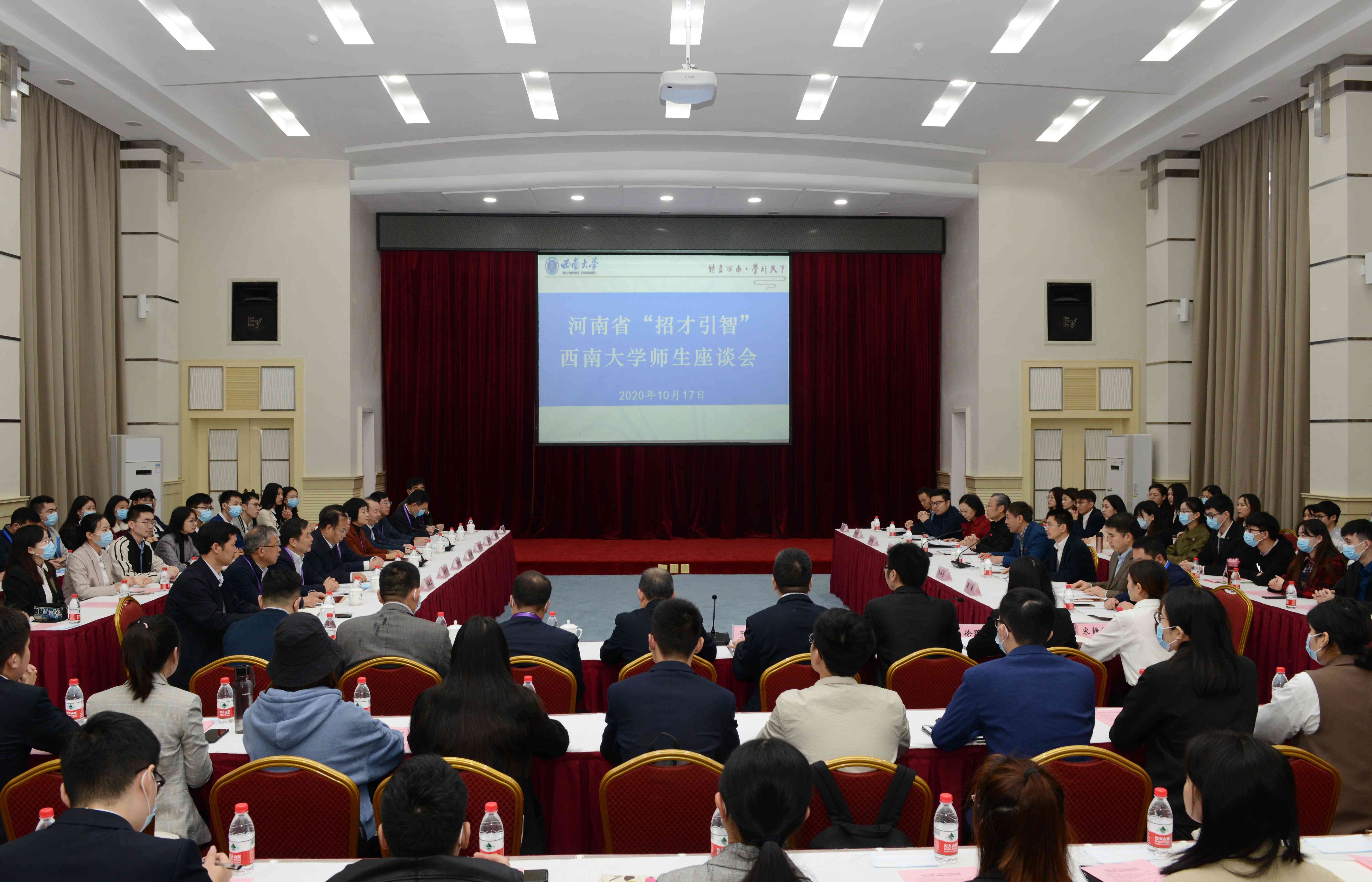 开幕式前,学校在桂圆宾馆金桂厅召开河南省招才引智西南大学师生座谈会,学校党委副书记安春元、潘洵,河南省人力资源和社会保障厅厅长刘世伟一行,学校相关职能部门负责人,校内河南籍专家教授代表于泽元教授、丁伟教授,有意向前往河南就业的毕业生60余人参加座谈。安春元在座谈会上介绍了西南大学发展概况,刘世伟介绍了河南发展情况和招才引智优惠政策,于泽元教授、丁伟教授,毕业生代表分别发言。潘洵主持座谈会。