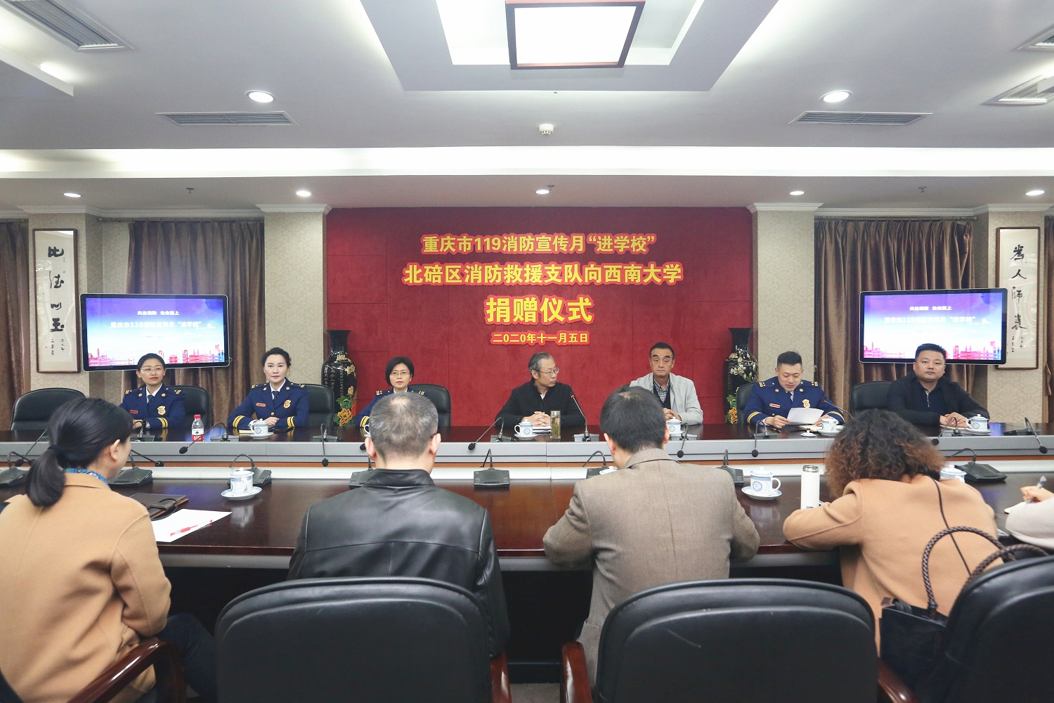 为切实加强学校消防建设,全面提升学校消防安全水平,11月5日上午,“重庆市119消防宣传月‘进学校’北碚区消防救援支队向西南大学捐赠仪式”在行署楼第五会议室举行。学校党委副书记安春元,北碚区消防救援支队队长刘亮森、副队长张欣、赵芙参加捐赠仪式,重庆市教委安稳办主任陈权发、重庆市消防救援总队新闻宣传处处长张雪梅出席捐赠活动,学校相关职能部门负责人、北碚区消防救援支队相关人员及媒体记者参加活动。