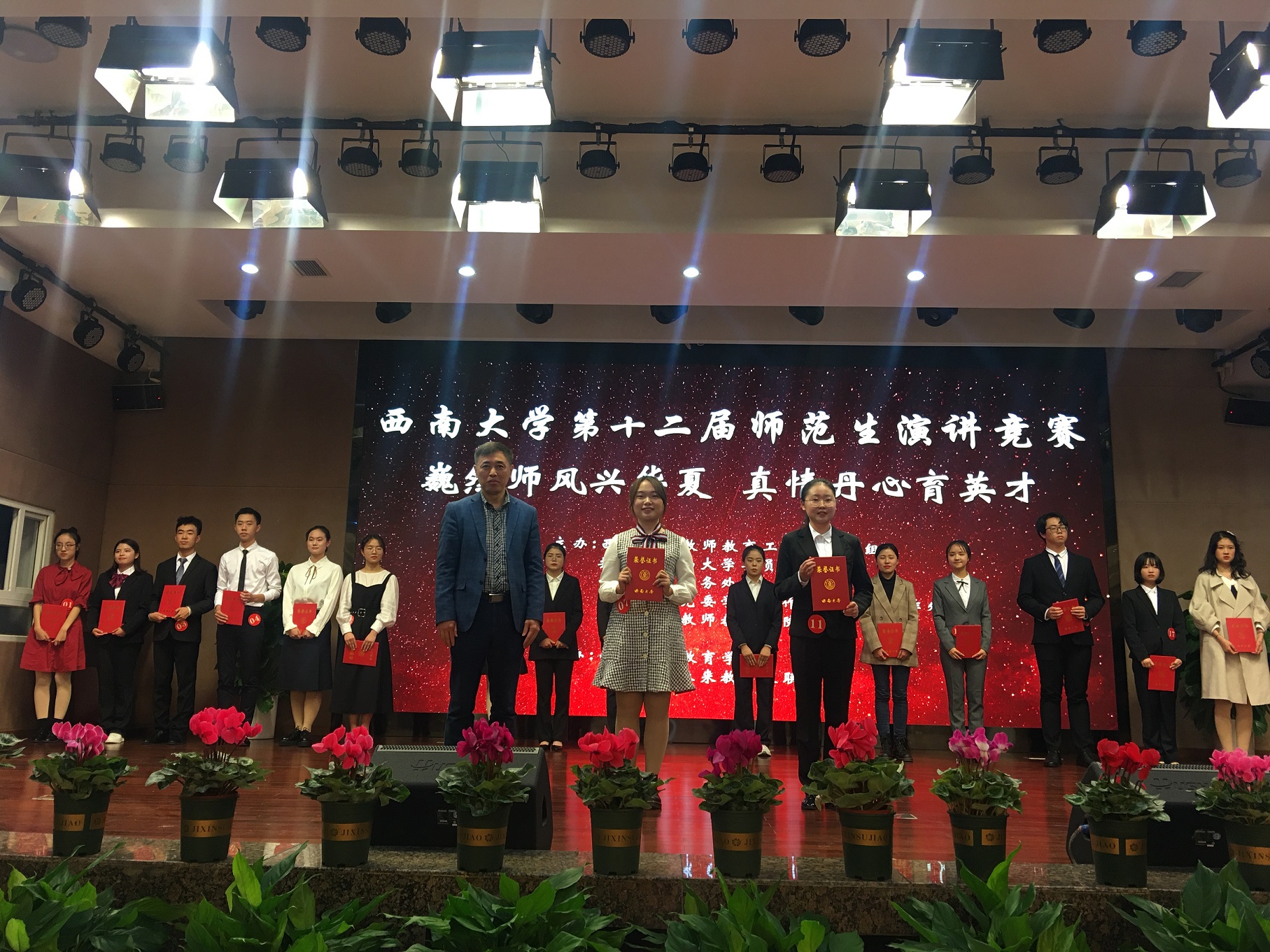 11月8日,以“巍然师风兴华夏,真情丹心育英才”为主题的西南大学第十二届师范生演讲比赛决赛在国际学院报告厅举行。党委副书记潘洵、学校教师教育工作领导小组有关单位负责人出席,各师范生培养学院有关领导、师生代表近500人观摩了比赛。