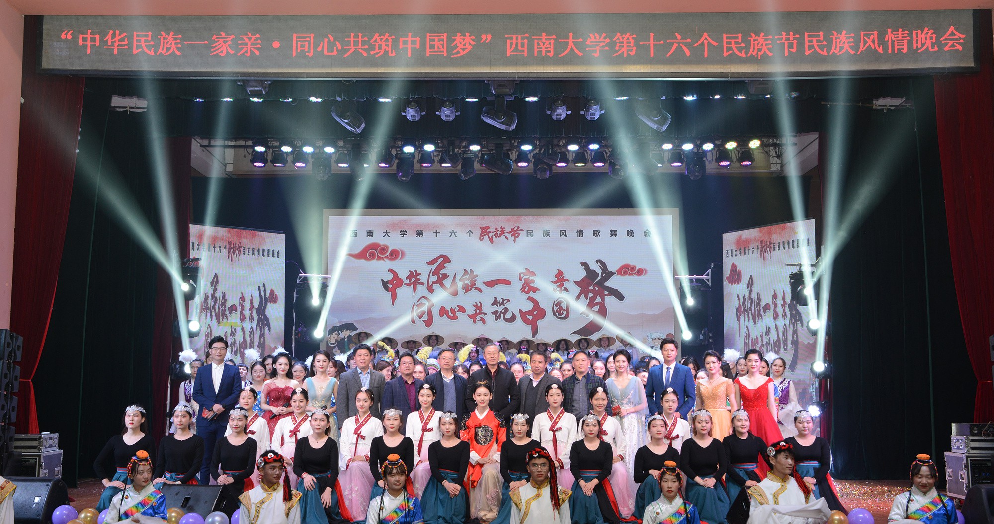 当晚,民族风情歌舞晚会在光大礼堂举行,安春元及学校民族工作领导小组部分成员全程观看演出。晚会分为“水浸碧天万物兴”和“山海浮金盛世平”两个篇章,流光溢彩的舞台,婀娜多姿的舞步,深情高亢的歌声,各民族师生载歌载舞,礼赞国泰民安。晚会为各民族的文化交流提供了宝贵的平台,既展现了各民族瑰丽文化的独特魅力,亦彰显了学校学子的青春活力。