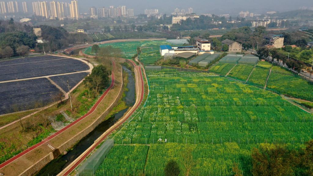 ↑2月22日拍摄的重庆市油菜工程技术研究中心的油菜花田(无人机照片)。