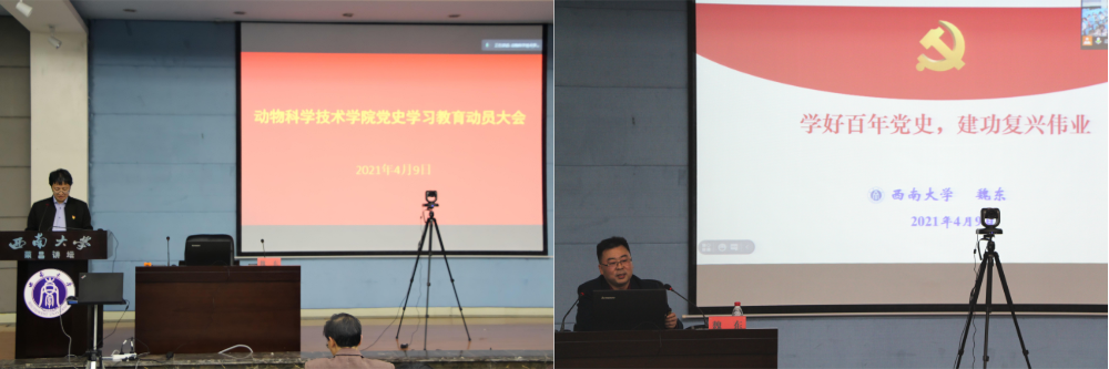 4月9日下午,动物科学技术学院党委召开党史学习教育部署会,学院党委书记赵智华从充分认识开展学习党史的重大意义、切实增强学习活动的政治责任感、使命感和自觉性及提高开展党史学习教育的有效性三个方面提出要求。动员部署会后,学院党委邀请学校荣昌校区基础部主任魏东为全体党员作党史学习教育专题辅导:“学好百年党史 建功复兴伟业”。讲座紧紧围绕主题,从“深刻理解新时代深入开展党史学习教育的重要意义”“准确把握百年党史的基本脉络和基本历史经验”“正确掌握百年党史学习方法和途径”三个方面进行解读。