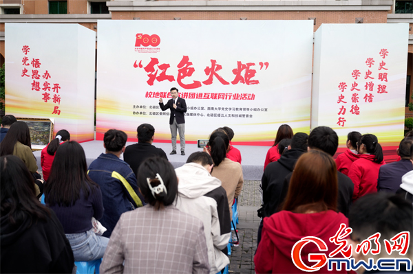展油画、说快板、讲评书……4月20日,在西南大学(重庆)产业技术研究院中心广场上,学校与北碚区成立的“红色火炬”校地联合党史宣讲团正用多种艺术形式的党史教育面向互联网行业轮番“开讲”。活动受到光明网、重庆日报、重庆卫视、上游新闻等多家媒体广泛报道。