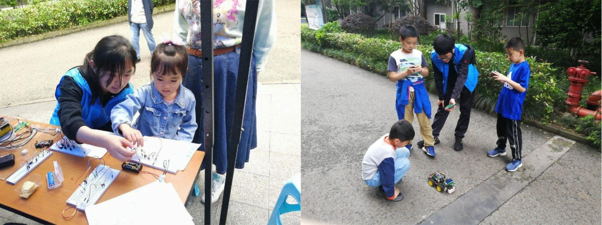 活动开始,志愿者们带领10余名小朋友“E探究竟”,宣传电信知识,普及电信文化。活动共分为两个部分。第一个部分是电子作品体验,让社区小朋友体验学院同学自行设计的智能小车和智能手环。智能小车通过智能摄像头识别出正确的路线,并配备超声波避障系统完成自动避障,小朋友只要将小车放在预先设定好的路线上,小车就能自己沿路线跑动。智能手环通过压力传感器和陀螺仪等能够测量出佩戴者走的步数和佩戴者此时的心率,小朋友只要带上智能手环走动,智能手环上面就会显示出小朋友走动的步数和此时心率。活动第二个部分是带领社区小朋友做电子小实验,共设计了五个小实验,分别是“简易电视遥控器”“简易电子门铃”“简易光控开关”“简易无线充电”和“简易电动车防盗报警器”。实验结束后,小朋友们还意犹未尽,这样的活动很受孩子们的欢迎,也得到了家长们的高度赞扬,孩子们在玩耍中增长了知识。