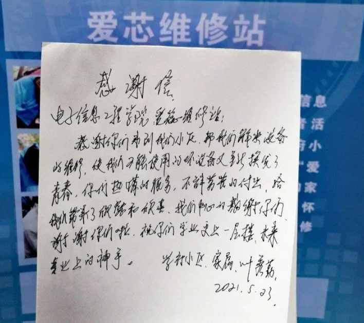 随着活动的进行,“爱芯维修站”也陆续收到了居民们送来的各种损坏的旧家电。大学生志愿者充分利用自身的专业知识,查找旧家电故障原因,分析每件家电存在的问题,积极处理检查出的问题。同时耐心地向居民朋友讲解家电正确使用方法,宣传安全用电知识。热情细致地服务,得到居民地连连好评。现场气氛十分活跃。活动现场,部分志愿者上门修理,让更多居民得到了帮助。一位居民还手书一封感谢信表达了对志愿者们的感谢。