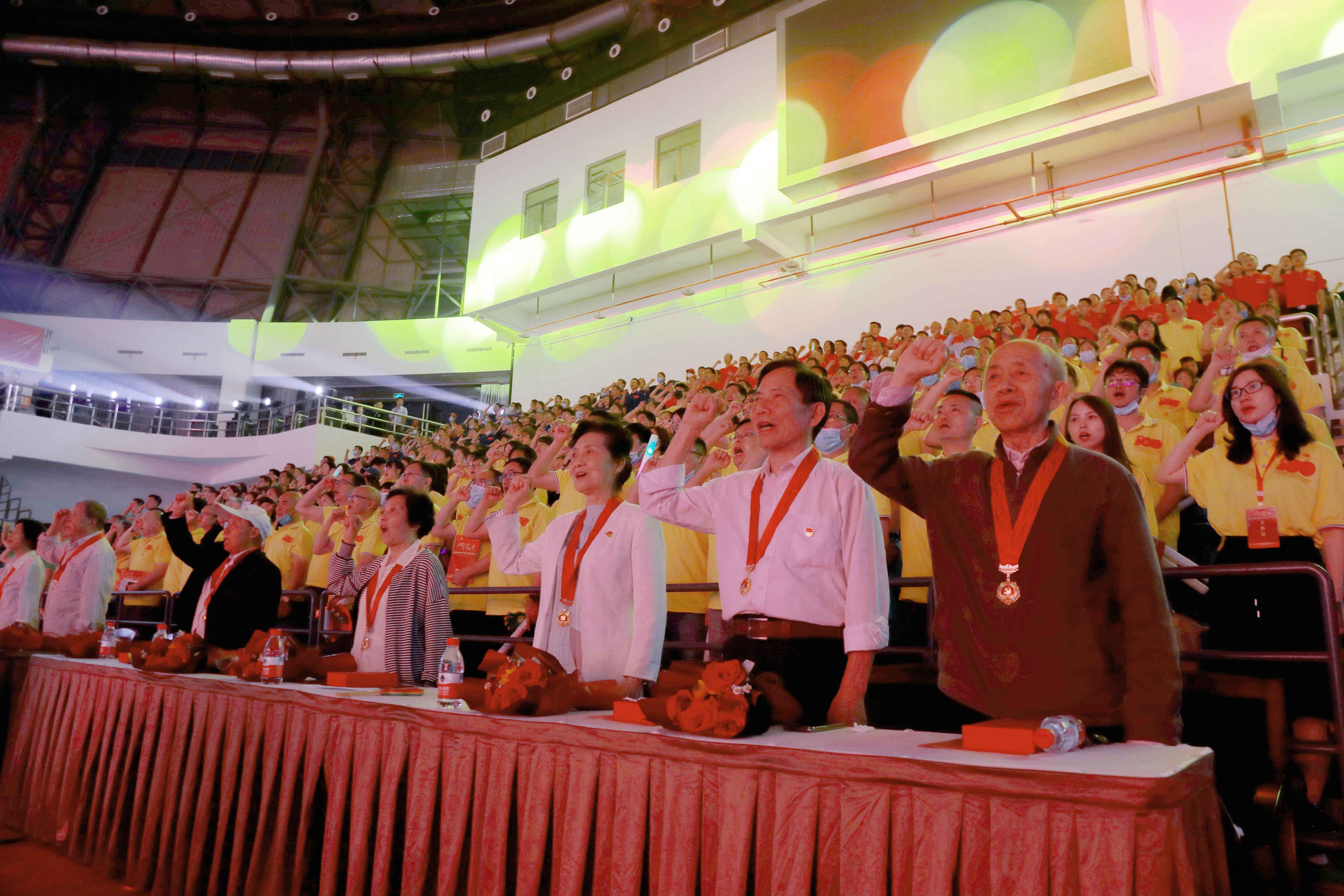 “我志愿加入中国共产党,拥护党的纲领……”全体与会党员在晚会的尾声重温了入党誓词。响亮的宣誓声在会场响起,提醒每一名共产党员要不忘初心、牢记使命,坚定信念、履职尽责。最后,现场全体人员合唱《没有共产党就没有新中国》,一起用心底最美的歌声赞美中国共产党,献礼党的百年华诞!