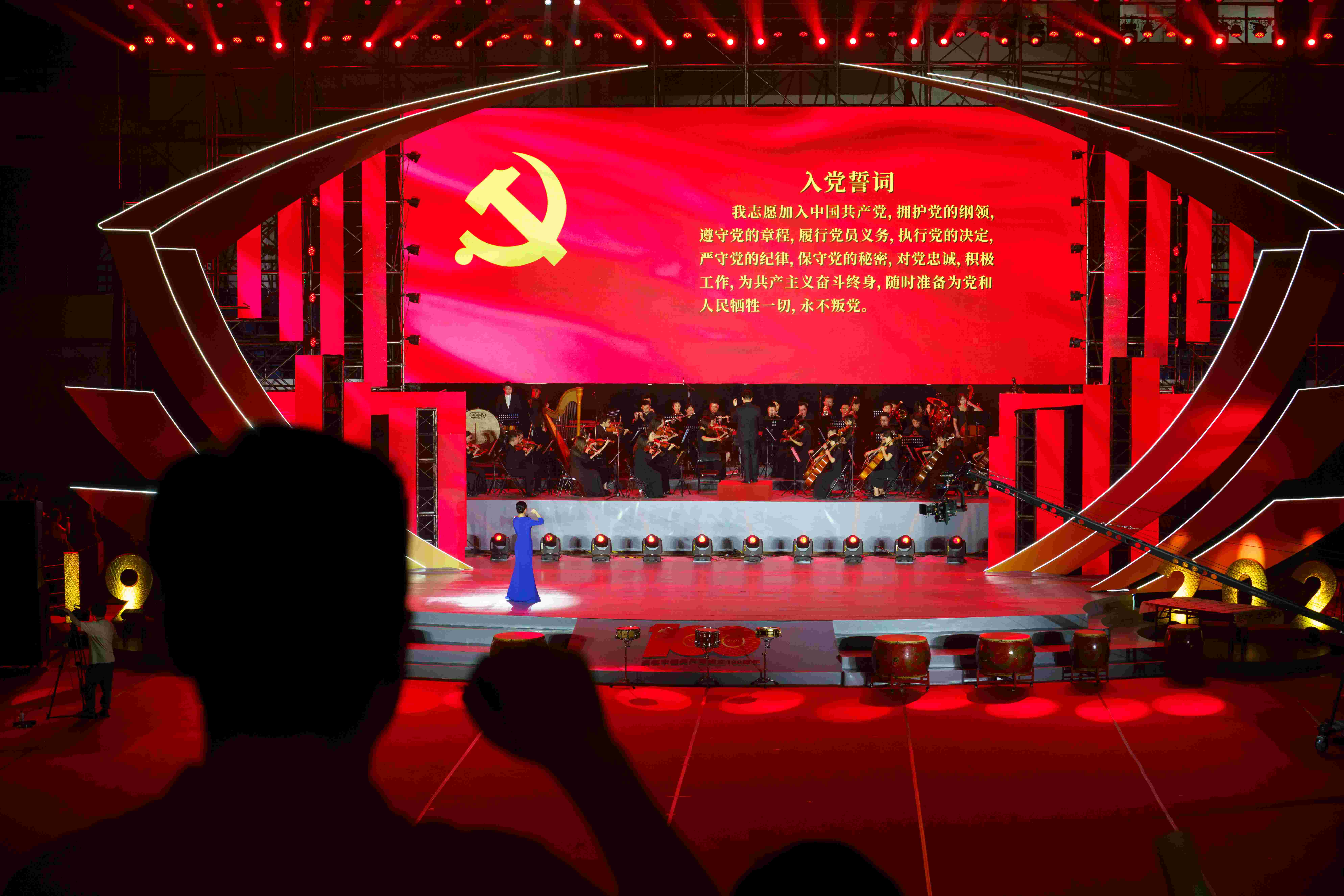 随后,晚会序幕缓缓拉起。传到观众席的首先是阵阵钟声,大屏幕的黑底上依次浮现年份数字——1840、1860、1894、1900、1919、1921,云彩中朝阳东升,一声声澎湃的鼓点震荡人心。