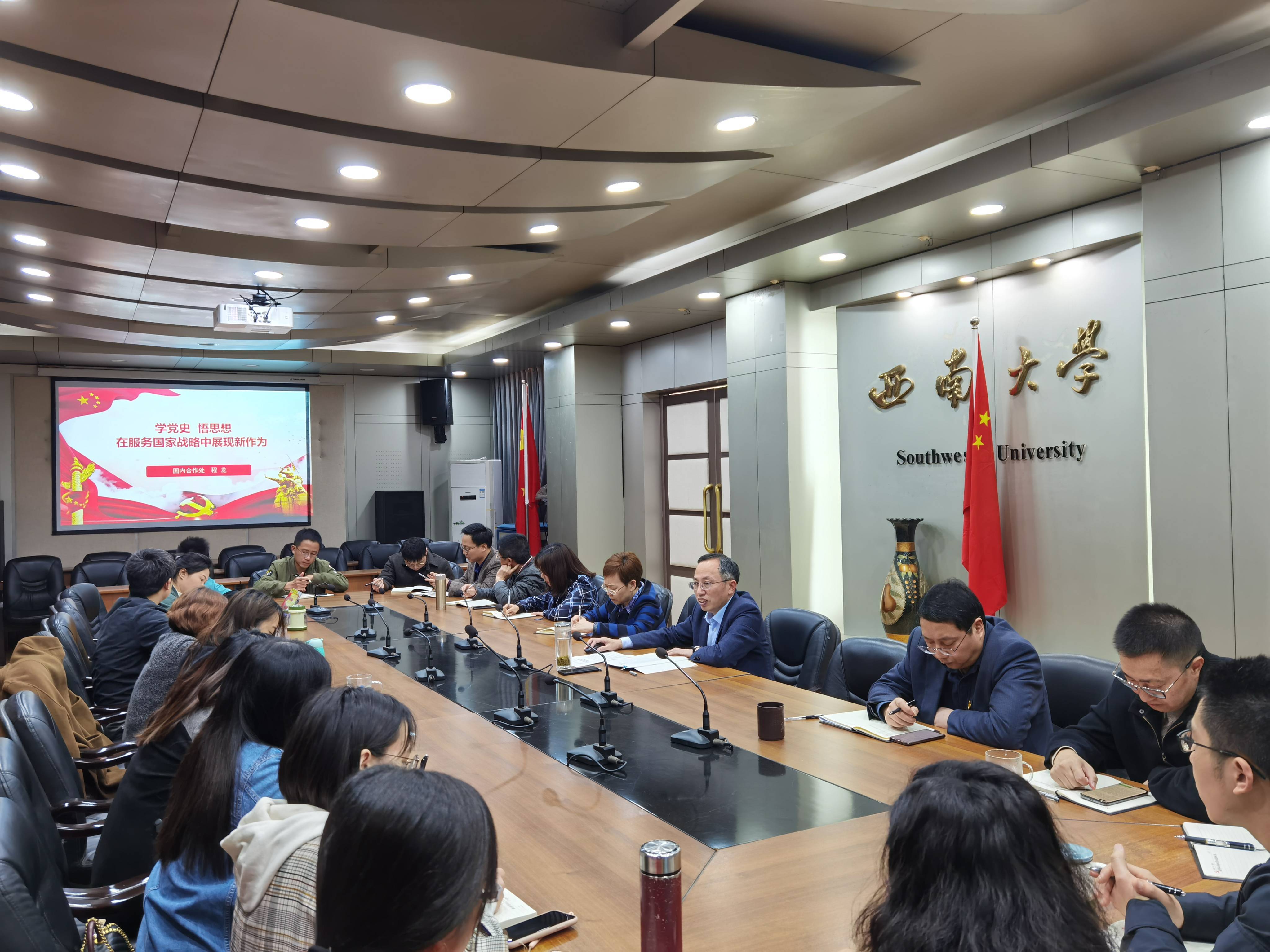 在此基础上,国内合作处还积极将党史学习教育与业务工作推进相结合,开展了“传承红色基因,服务乡村振兴”活动,深入学院(部)和荣昌校区等相关单位调研社会服务工作,帮助各单位谋划“十四五”社会服务和服务乡村振兴工作;赴宜宾市、涪陵区、重庆市畜牧科学学院进行考察交流,推进区校、院校合作;赴城口县、昌宁县开展对口帮扶工作,推进巩固脱贫攻坚成果与乡村振兴有效衔接。切实将党史学习教育融入到社会服务工作中去,学思践悟,在百年党史中汲取力量,增加使命感和责任感,为学校“双一流”建设和服务国家战略贡献力量。