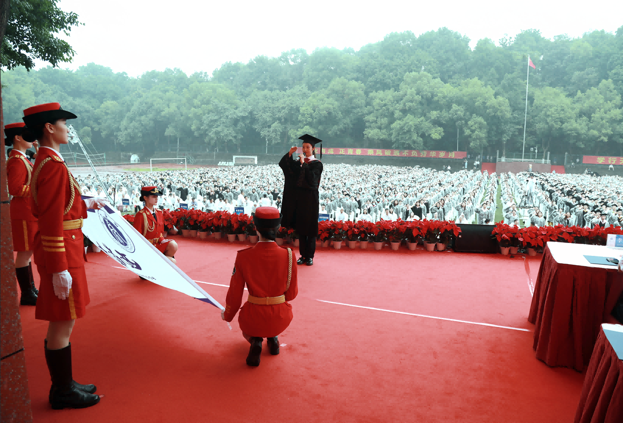 “今天,我光荣毕业了,我以西南大学学子名义庄严宣誓!”在毕业生宣誓环节,重庆市优秀毕业生、外国语学院英语专业公费师范毕业生矫彤帅同学领誓,在场全体毕业生起立,面向西南大学校旗铿锵有力地宣誓。