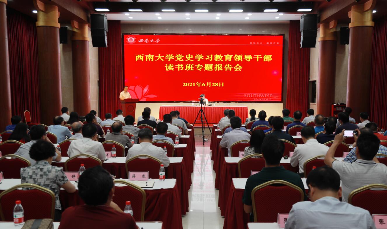 6月28日下午,学校召开党史学习教育领导干部专题读书班第二场专题报告会。报告会设主会场和视频分会场,学校党委委员、纪委委员、二级党组织书记在主会场东方红会议厅听取报告,学校全体处级党员领导干部、党支部书记在分会场通过视频方式听取报告。教育部党史学习教育高校第十一巡回指导组副组长赵忠、谢守成,成员黄玉新、魏立明莅临指导。
