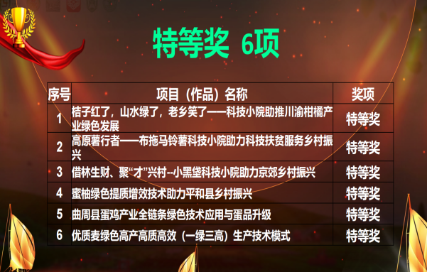 本次大赛吸引了来自中国农业大学、西南大学、四川农业大学、安徽农业大学、福建农林科技大学等全国涉农高校的100支科技小院队伍参加,经过初赛审查、决赛路演和专家评委现场评分等程序,共角逐出6支队伍荣获特等奖、9支队伍荣获一等奖、15支队伍荣获二等奖。