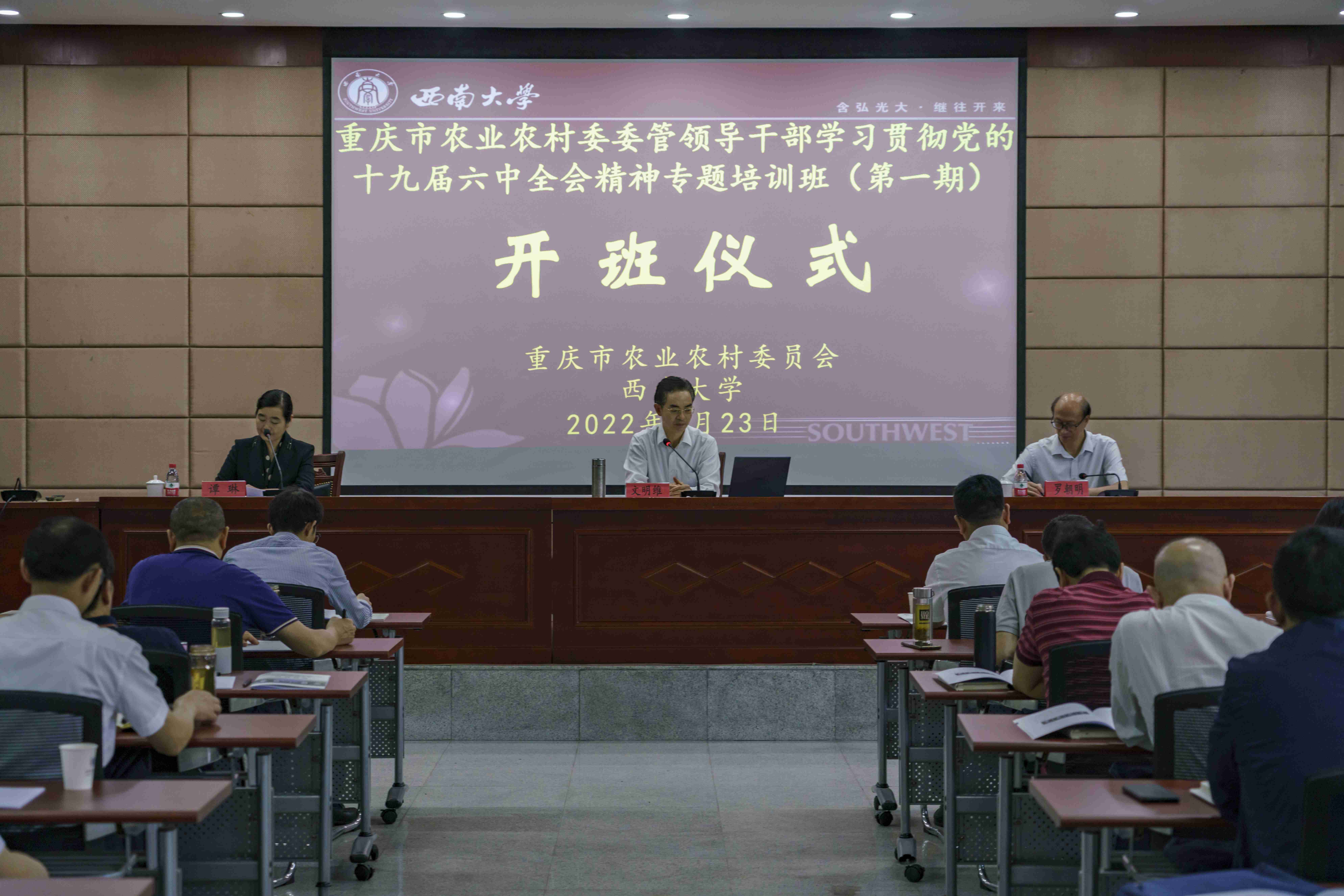 开班式由学校继续教育学院院长罗朝明主持,继续教育学院党总支书记谭琳对培训班的顺利开班表示祝贺,对市农业农村委给予西南大学干部培训的信任表示感谢,并勉励学员以积极的学习态度,带着问题学、联系实际学、结合工作学,学有所获、学以致用。