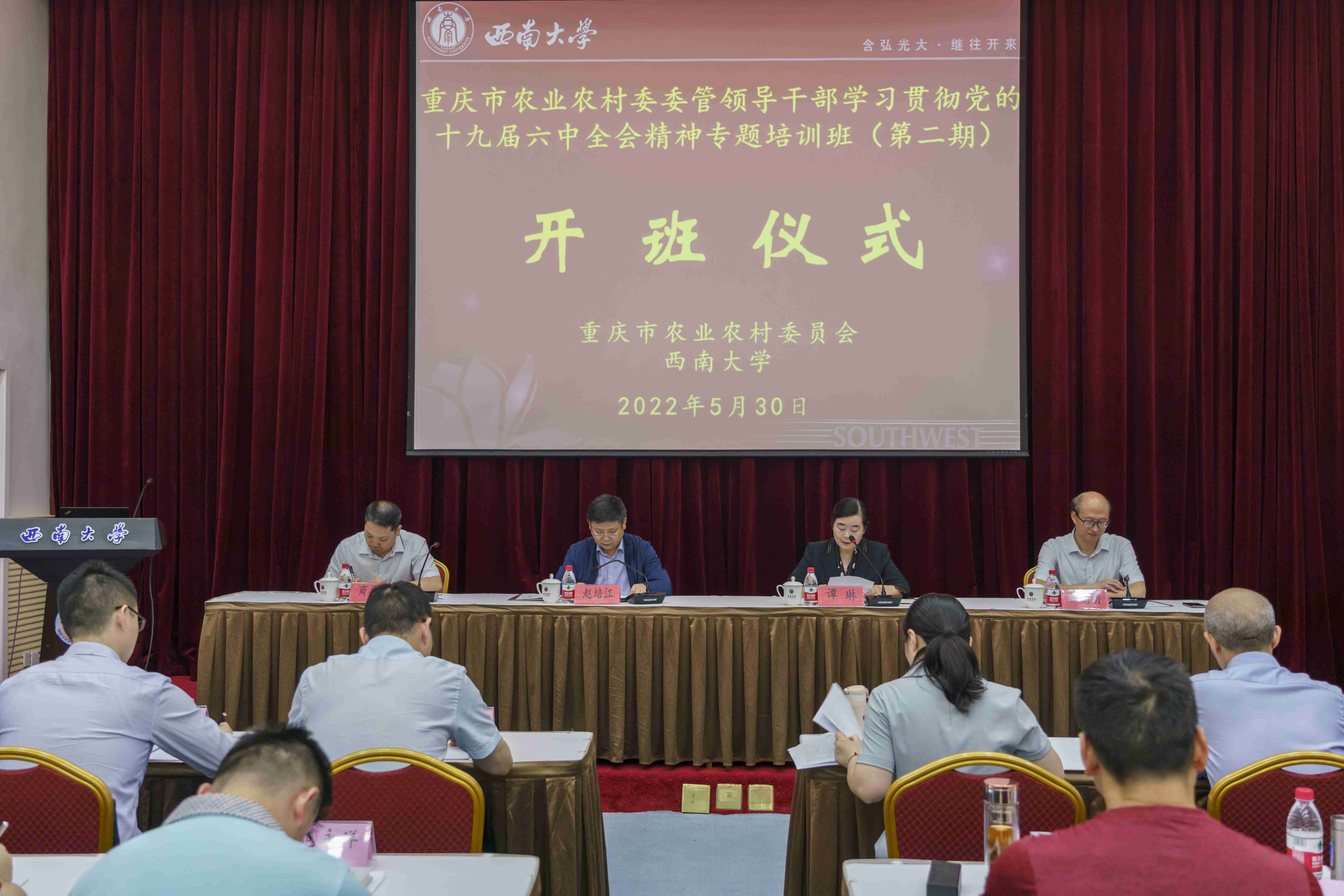 重庆市农业农村委委管干部学习贯彻党的十九届六中全会精神专题培训班于5月25日、30日分两期在学校顺利开班,来自重庆市农业战线的140余名处级干部在学校进行为期三天的专题培训。重庆市委农业农村工委副书记文明维、市农业农村委二级巡视员赵培江分别出席第一期、第二期开班仪式。