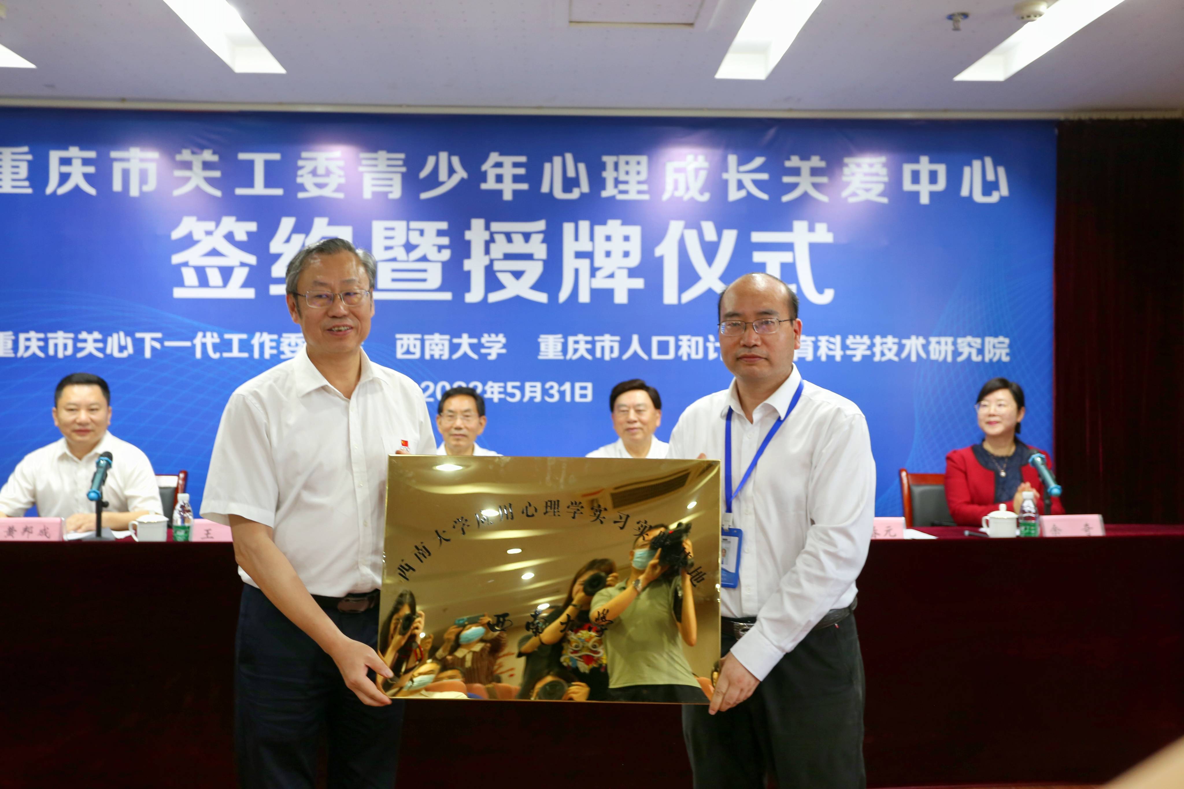 签约授牌仪式上,韩国涛、余奇和学校心理学部部长陈红代表三方签署“儿童青少年心理健康服务与研究合作协议”,唐情林分别向心理学部和市人口计生研究院授予“重庆市关工委青少年心理成长关爱中心”牌匾,安春元向重庆市人口计生研究院授予“西南大学应用心理学专业实习实践基地”牌匾。