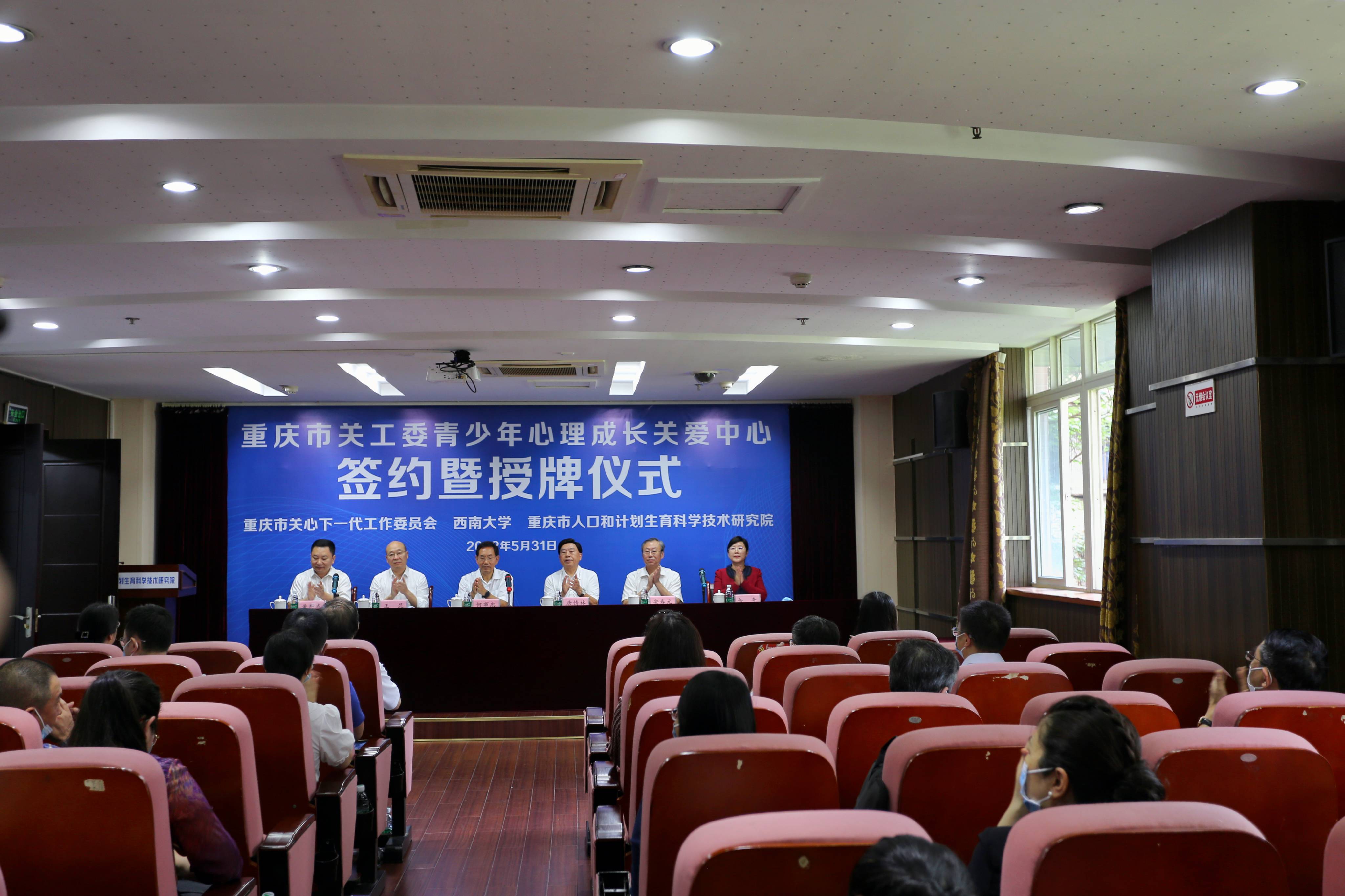 5月31日,在“六一”国际儿童节来临之际,心理学部与重庆市关工委、重庆市人口计生研究院举行“重庆市关工委青少年心理成长关爱中心” “西南大学应用心理学专业实习实践基地”签约暨授牌仪式。市关工委主任何事忠、常务副主任唐情林、副主任刘丽俐、秘书长韩国涛,市卫生健康委副主任王昆,市人口计生研究院党委书记黄邦成、院长余奇,学校党委副书记安春元出席仪式,学校国内合作处、心理学部有关领导教师参加仪式。
