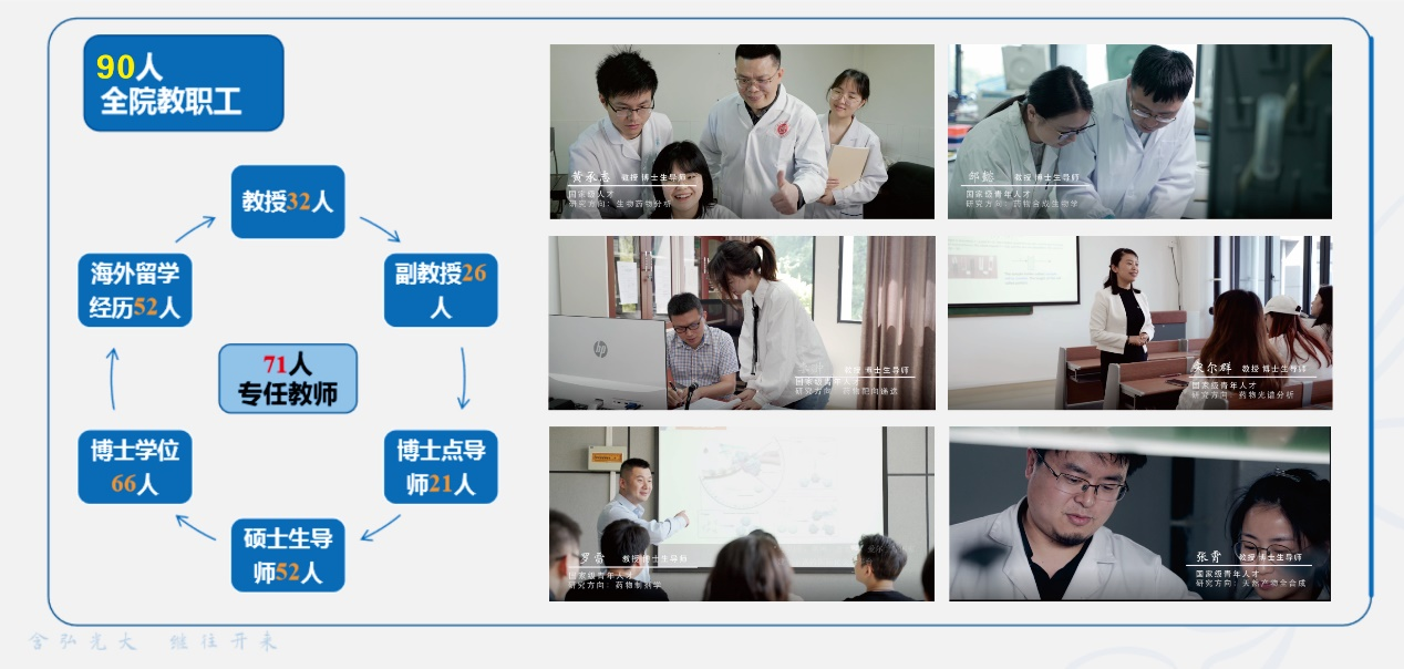 药学院 中医药学院建院16年,是超常规发展的16年。这16年间,学院获批党建双创全国样板党支部;获得两个国家级实验教学示范中心;建设了两个国家一流本科专业;获批“药学”学术学位博士点和“生物与医药”专业学位博士点;获批教育部工程中心;主持了国家重点研发计划、国家自然基金重点项目等重大科研项目;在Nature子刊、PNAS等顶级期刊发表论文。总结16年的超常规发展,得益于学院在队伍建设上付出的一系列努力。在过去的几年中,药学院共增加1位国家级人才和6位国家级青年人才,这支高水平的师资队伍有力推动了学院的高质量发展。