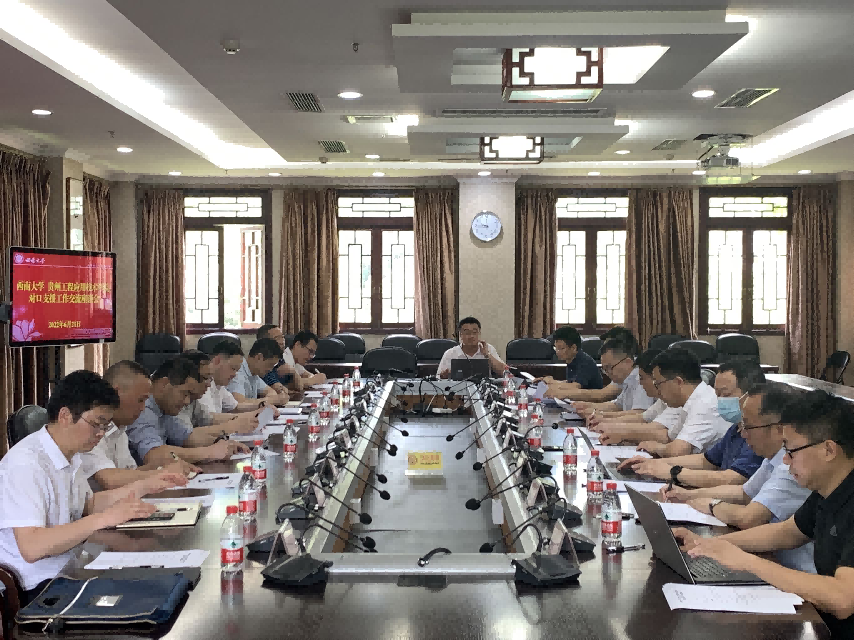 6月21日,贵州工程应用技术学院党委书记令狐荣锋、校长张嗣杰率队来校对接对口支援工作。学校党委书记李旭锋、副校长赵国华出席交流座谈会,党政办公室、发展规划与学科建设部、人力资源部、教务处、学生工作处、国内合作处等相关单位负责人参加座谈。会议由赵国华主持。