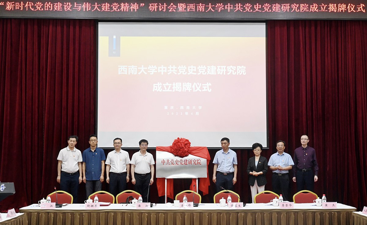 学校社会科学处处长邱江宣读《西南大学关于成立中共党史党建研究院的通知》,李旭锋为“西南大学中共党史党建研究院”揭牌,马克思主义学院党委常务副书记廖晓衡宣读学校中共党史党建研究院内设机构和人员名单。