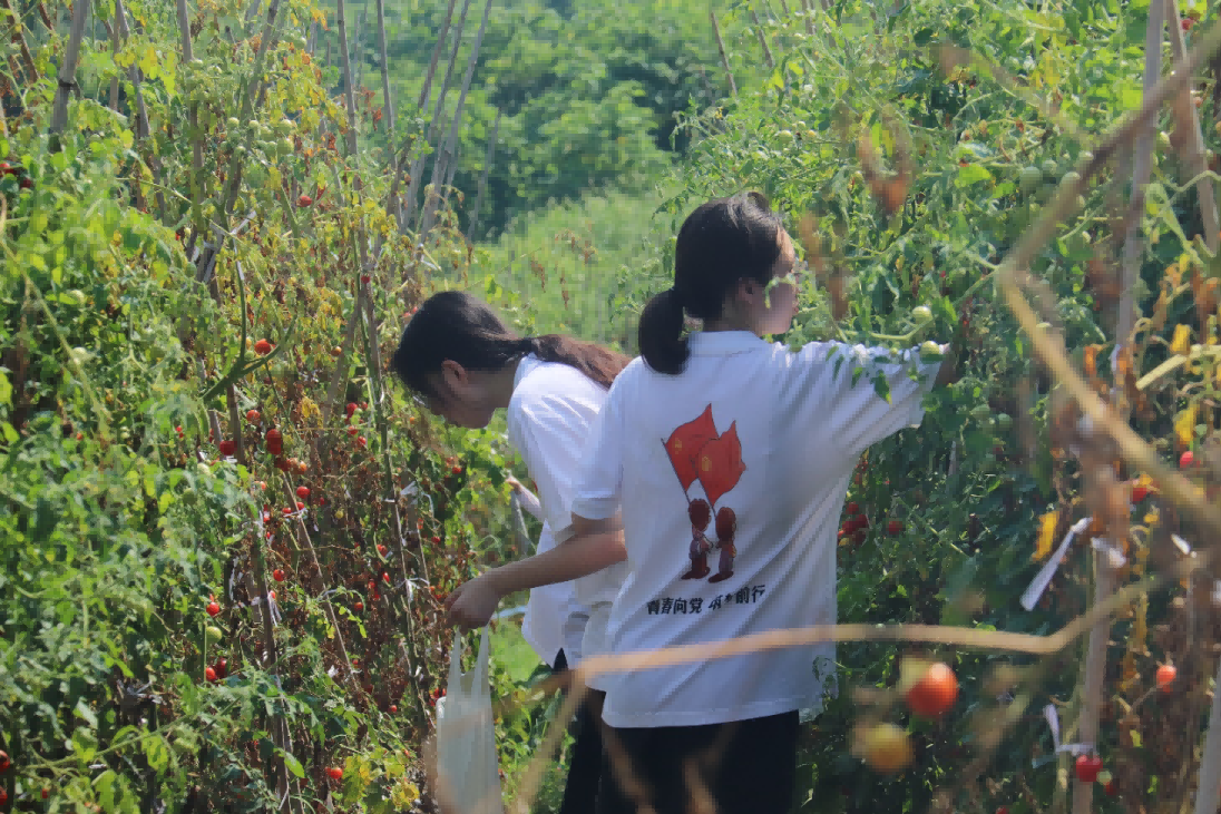 烈日下的番茄田里,身着统一服装的实践团成员们一手提筐子,一手摘番茄,采摘、入筐、运输一条龙包办,半天时间就帮村民完成了大部分采摘任务。