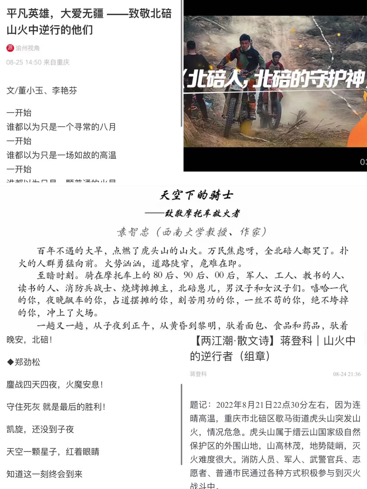 “聚是一团火/散是满腔情/是一种精神让他们在火魔前义无反顾/负重前行”新闻传媒学院董小玉在创作的诗歌《平凡英雄 大爱无疆》中,抒发了对救援力量的感激和山河永固的豪情;“今天/我无比热爱这座小城/每个北碚人/都是这座城市的守护神/守护它的美好/更爱守护人的朴素和坚强”这是教师教育学院骆鹏献给灭火英雄的诗,温柔似水又拥有固若磐石的力量,振奋人心;档案馆郑劲松也用一篇散文、两首诗歌致敬平凡英雄,他写到:“绿水青山存证/巴山夜雨知恩/温泉故里留情”“平凡英雄,不是孤勇者”,作者笔下流露的感激和感动令人动容。还有新闻传媒学院袁智忠散文作品《天空下的骑士——致敬摩托车救火者》、出版社蒋登科散文诗作品《山火中的逆行者》、美术学院石富的雕塑作品《北碚2022,中国》,书写了大火中的人性光辉和人民力量,无不凝聚起蓬勃的向火进军的生命激情,无不鼓舞着每个人保卫家园的坚强决心。