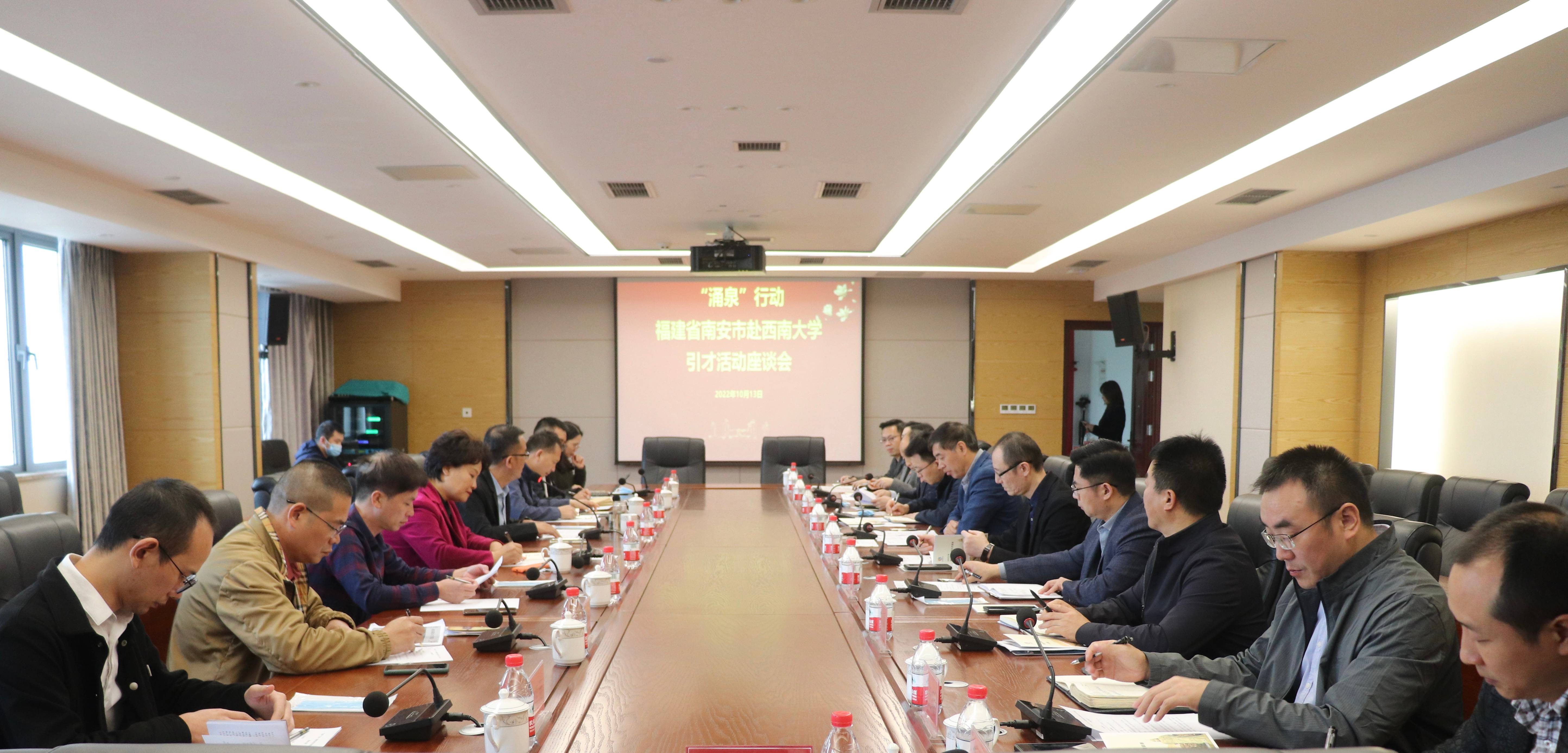 10月13日,“‘涌泉’行动——福建省南安市赴西南大学引才活动座谈会暨南安市人民政府与西南大学引才签约仪式”在荣昌校区顺利举行。南安市人民政府副市长陈志慧、荣昌区人大常委会党组副书记潘英、学校党委副书记潘洵出席活动。南安市政府办、人社局、就业人才中心和相关企业负责人,荣昌区人力社保局负责人,学校党委宣传部 党委网络工作部、党委学生工作部、党委研究生工作部、招生就业处和荣昌校区党工委 管委会等相关职能部门负责人参加活动。荣昌校区党工委书记周国安主持活动。