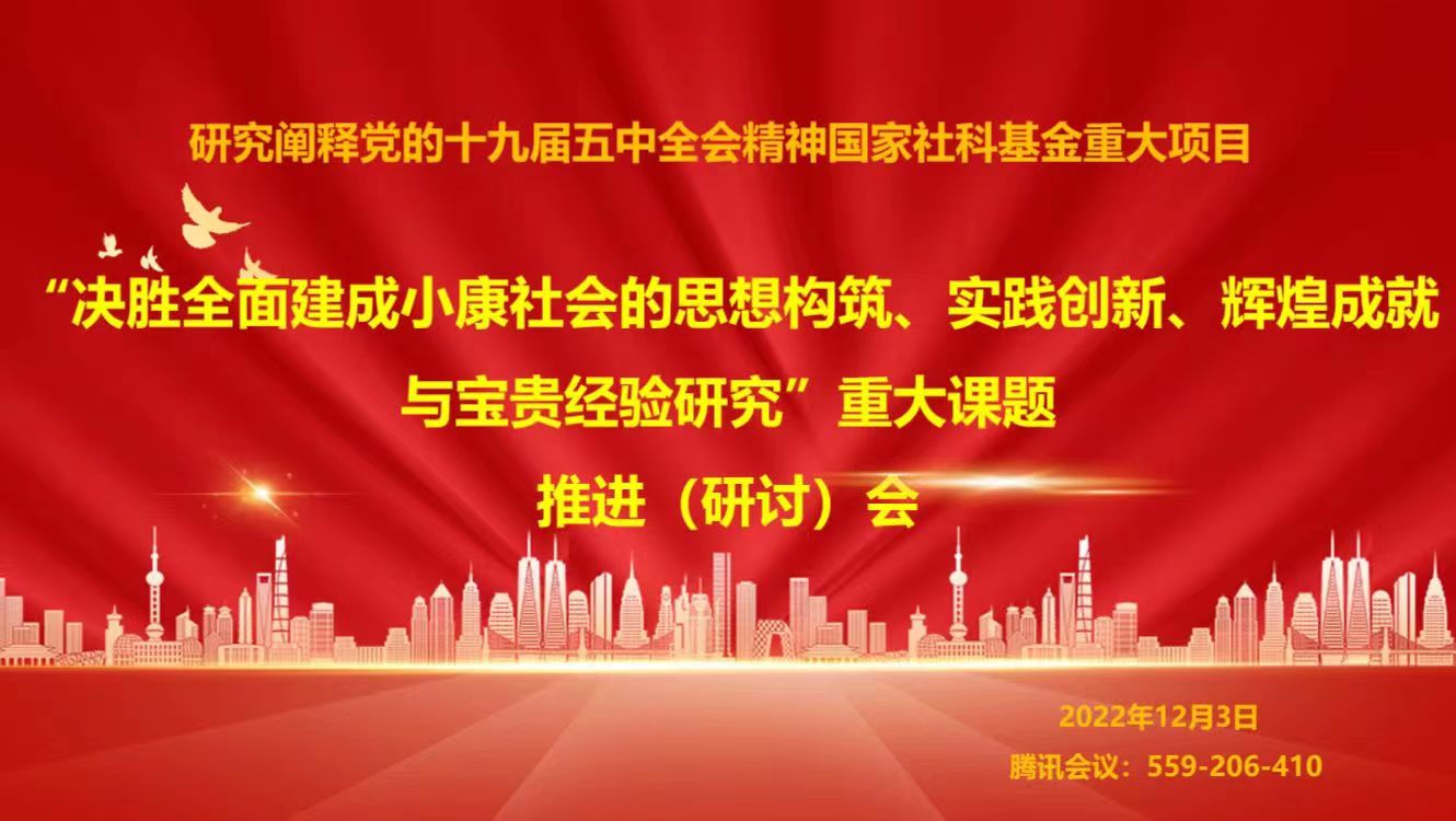 12月3日,研究阐释党的十九届五中全会精神国家社科基金重大项目“决胜全面建成小康社会的思想构筑、实践创新、辉煌成就与宝贵经验研究”重大课题推进(研讨)会在云端举行。中央马克思主义理论研究和建设工程专家、海南师范大学副校长白显良教授,学校马克思主义学院何玲玲教授、吴艳东教授、靳玉军教授、王丰教授,各子课题负责人及骨干成员,《新时期全面建设小康社会研究》书稿执笔者,部分马克思主义学院师生代表共70余人参加了推进(研讨)会。会议由课题首席专家黄蓉生教授主持。