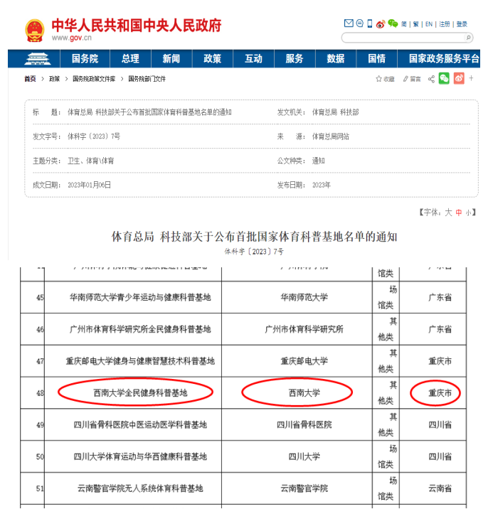 近日,中国政府网发布《体育总局科技部关于公布首批国家体育科普基地名单的通知》,西南大学全民健身科普基地成功入选,成为首批58所国家体育科普基地之一。