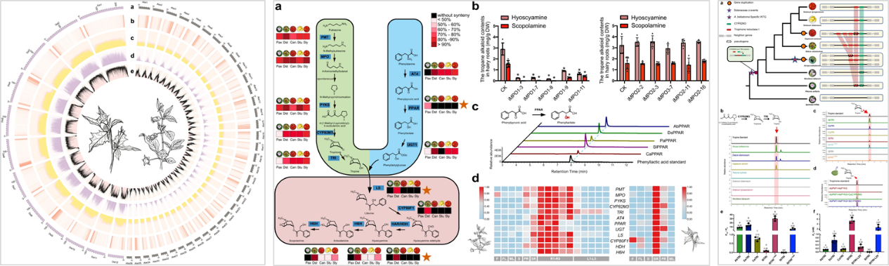 大多数茄科植物都能够产生托品,而仅有颠茄和草本曼陀罗等少数茄科药用植物能够产生莨菪碱和东莨菪碱。托品经过一系列连续酶促反应最终生成莨菪碱和东莨菪碱。该研究发现茄科植物共有的一个由CYP82M3和TRI构成的基因簇是托品广泛分布于茄科植物的重要遗传基础;栽培药材颠茄和草本曼陀罗共享一条高度保守的途径来合成莨菪碱和东莨菪碱;其他茄科植物丢失了位于TRI下游的生物合成基因,从而导致无法合成莨菪碱和东莨菪碱。在此基础上,筛选获得了具有高催化活力的TRI和LS,为采用代谢工程和合成生物技术生产mTAs提供了高质量元件;新发现了莨菪碱N-脱甲基酶,其功能是将莨菪碱转化为N-去甲莨菪碱(治疗慢阻肺特效药异丙托溴铵的关键中间体)。颠茄既是生产mTAs的重要栽培药材,也是研究TA代谢的模式植物,其高质量基因组的发布,为进一步发现TA代谢相关基因和培育优质颠茄种质奠定了基础。