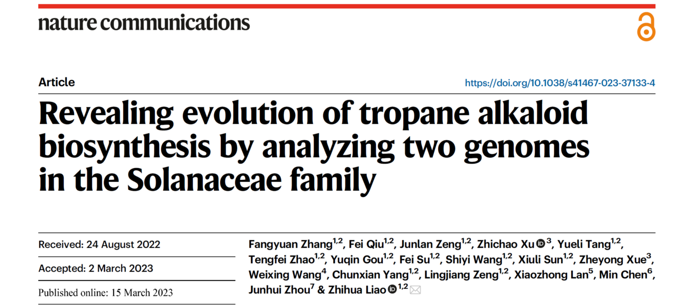 3月15日,廖志华教授团队在Nature Communications上发表了题为《Revealing evolution of tropane alkaloid biosynthesis by analyzing two genomes in the Solanaceae family》(通过分析两个茄科植物的基因组揭示托品烷生物碱生物合成的演化机制)的研究论文,揭示了茄科托品烷生物碱生物合成途径的演化机制。