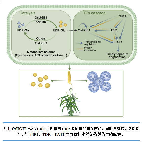 3月15日,Molecular Plant(IF2021=21.949)在线发表了学校水稻研究所题为“UDP-差向异构酶(UGE1),兼职转录激活因子,在水稻绒毡层降解和雄性生殖中发挥重要作用”(UDP-glucose epimerase 1, moonlighting as a transcriptional activator, is essential for tapetum degradation and male fertility in rice)的最新研究成果。该研究鉴定了一个水稻雄性不育突变体osuge1,绒毡层降解延迟,导致完全不育。OsUGE1蛋白能够催化UDP-Glc和UDP-Gal的相互转化,而突变的osuge1蛋白因缺乏UDP-葡萄糖差向异构酶活性,不能催化UDP-Glc和UDP-Gal的相互转化,进而导致osuge1突变体穗部UDP-Gal含量增高、UDP-Glc含量降低。与其他已报道的UGEs的细胞质定位不同,OsUGE1定位在细胞质和细胞核,且具有转录激活活性。通过生化和遗传学实验证明OsUGE1参与了调控水稻绒毡层降解的TIP2-TDR-EAT1转录调控级联反应:OsUGE1调控EAT1的表达,OsUGE1的表达也受到TIP2和TDR的调控。此外,该研究还发现OsUGE1通过直接结合OsUGE1启动子中的E-box元件来调节其自身基因的表达。综上,本研究揭示了一种复杂而精密的新型调控模式,为研究植物雄性发育提供了新的途径(图1)。