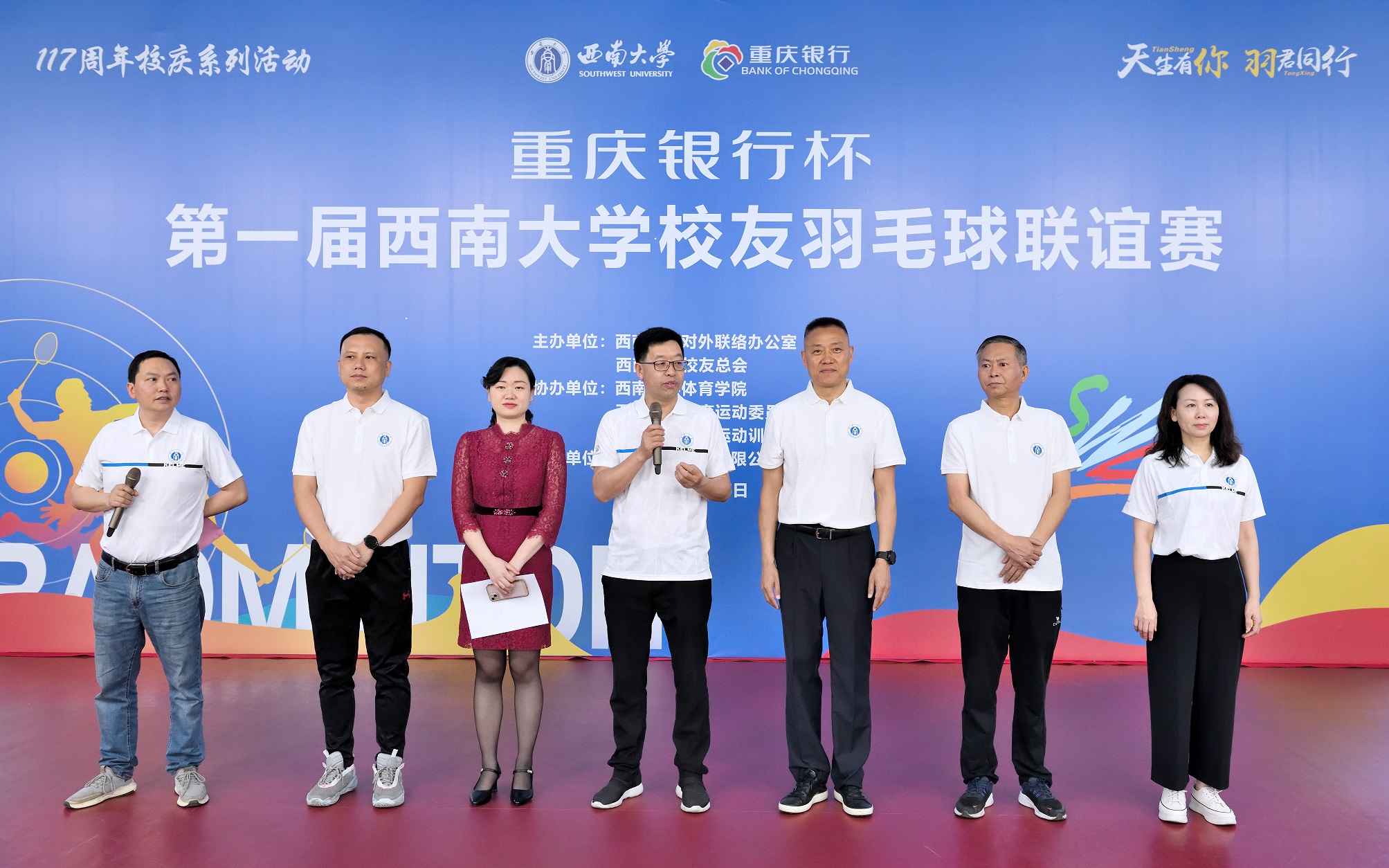 天生有你,“羽”君同行。4月15日,“重庆银行杯”第一届学校校友羽毛球联谊赛在羽毛球馆拉开帷幕。师生校友们欢聚,以球会友、以赛传情,弘扬健康力量,迎接母校117周年校庆。副校长赵国华,重庆银行股份有限公司北碚支行副行长周密出席开幕式,学校对外联络办公室、体育学院有关领导参加开幕式。