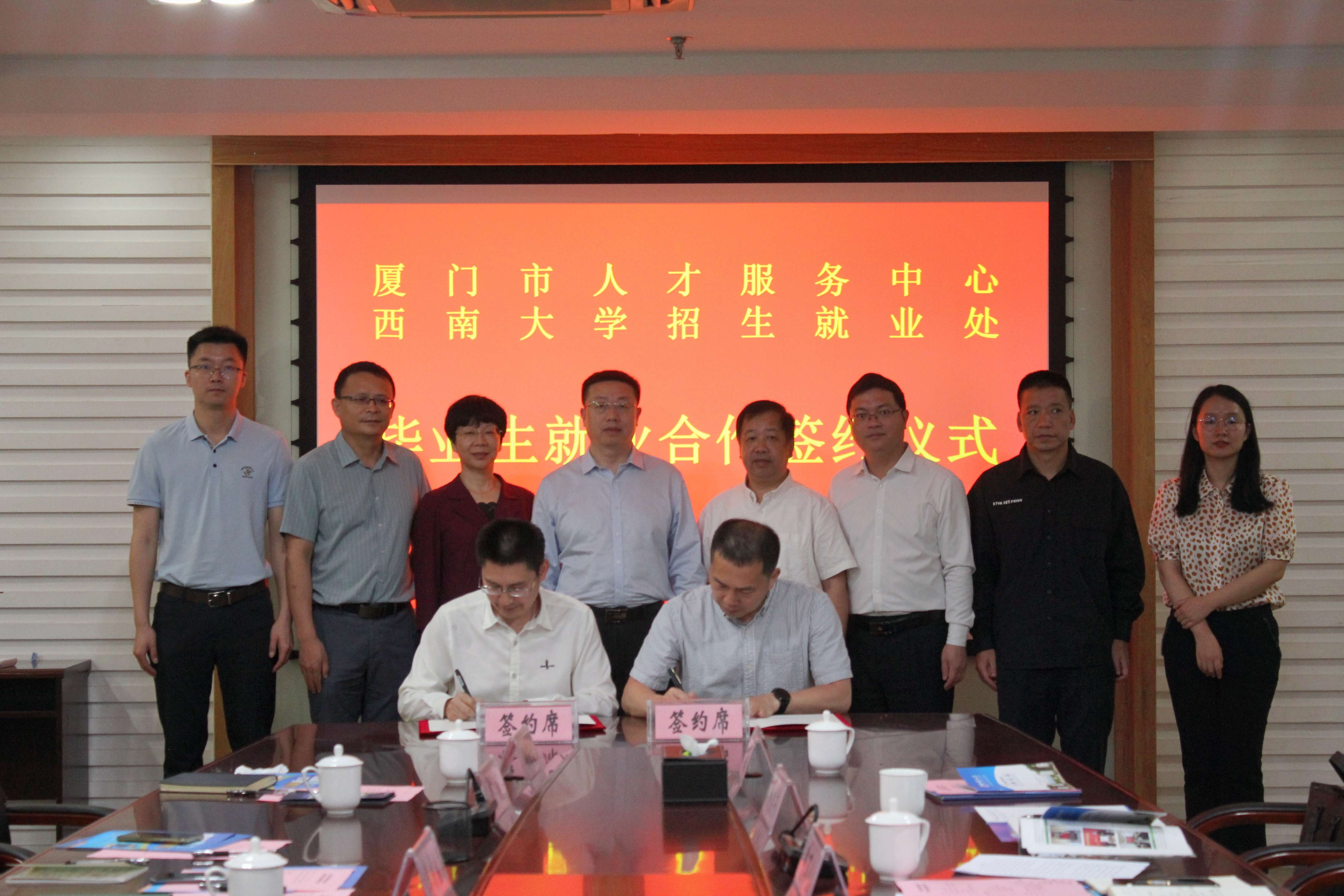 4月17日,夏玉峰一行赴厦门市人才服务中心考察交流。厦门市人才服务中心党总支书记、主任包伟文,党总支副书记、中心副主任陈七三,规划发展部部长陈万化,就业服务部部长陈云,厦门银祥集团有限公司总监陈映红等三家企业代表出席相关活动。双方汇报厦门市产业发展及人才政策、西南大学毕业生情况,就加强校地合作、精准对接供需交换意见,就进一步增加合作深度、提高合作精准度、拓展合作广度达成共识,并签订合作协议。