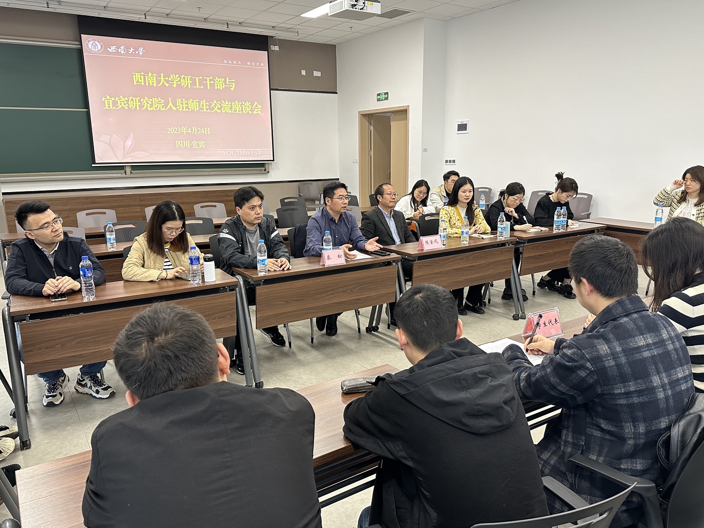 与会研究生代表围绕入驻园区以来的学习生活感悟进行交流发言。会议结束后,全体与会人员在研究院行政楼前举行“西南大学研究生社会实践基地”揭牌仪式。
