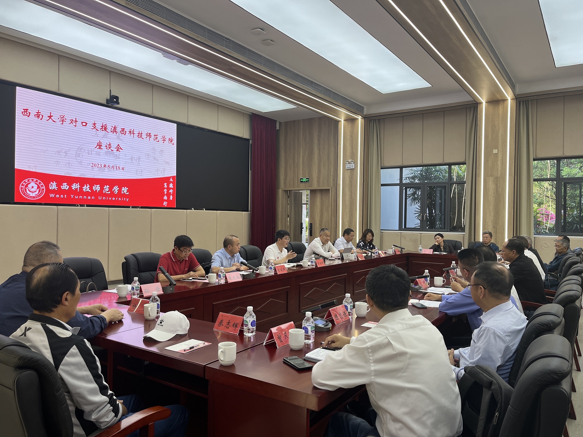 5月18日,李旭锋一行在滇西科技师范学院召开对口支援工作座谈会。会上,“银龄教师”代表李名扬介绍了西南大学“银龄计划”专家团在滇西科技师范学院开展人才培养、学科建设、课题研究、社会服务等方面工作成效。李旭锋为学校聘任的滇西科技师范学院兼职专业硕士导师和博士导师颁发聘书,葛信勇与滇西科技师范学院党委副书记施勇共同为“西南大学——滇西科技师范学院专业学位研究生联合培养基地”揭牌。