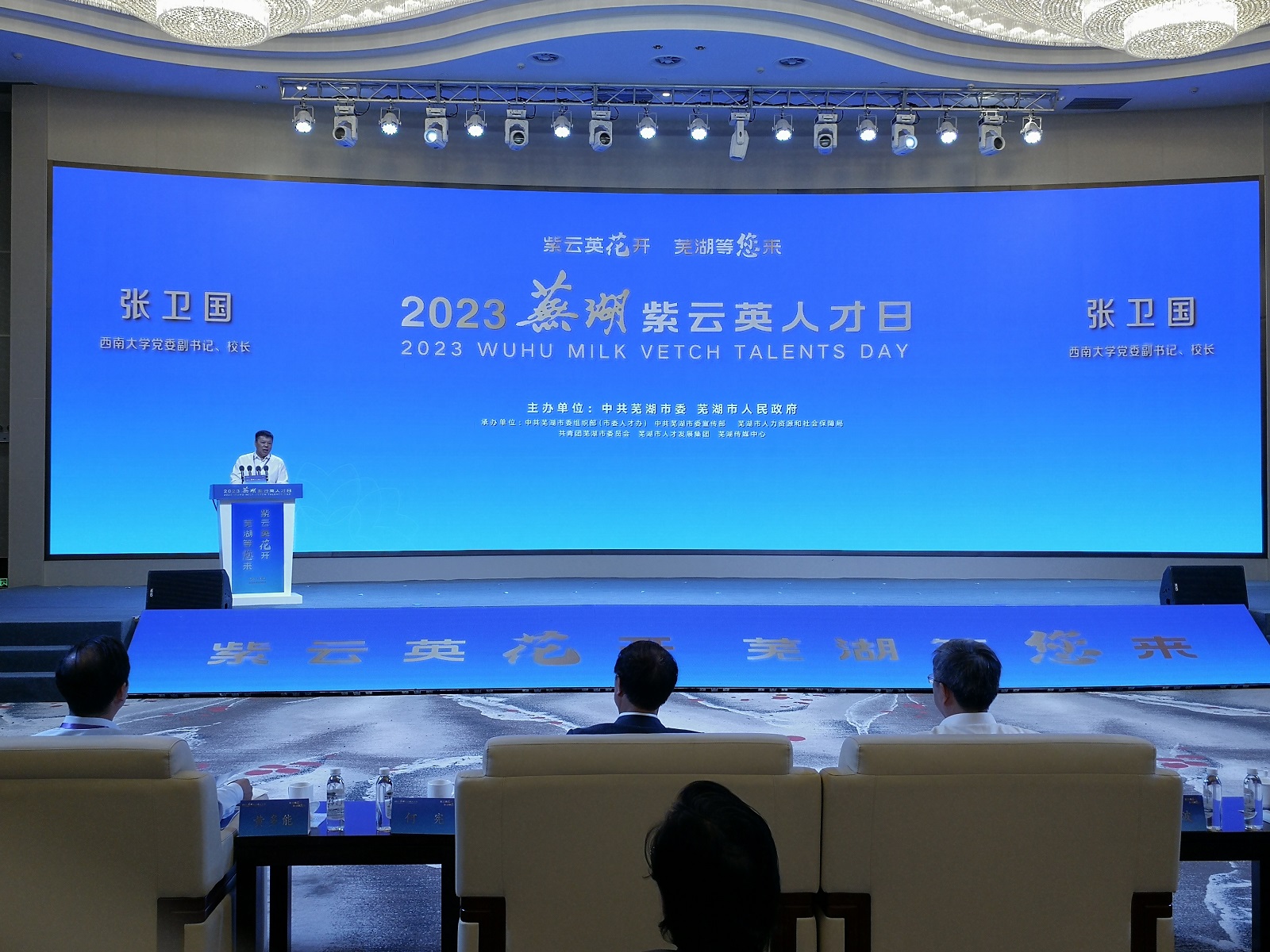 在芜湖,张卫国出席芜湖市委、市政府主办的2023年芜湖市第二届紫云英人才日开幕式并致辞。张卫国强调,近年来,学校与芜湖市不断加强交流,产学研合作不断拓展,成果喜人。希望校地双方进一步搭好用好合作平台,在人才培养、引才育才、产学研协作平台等方面,更广、更深持续拓展深化合作,不断创造共享共赢发展的新格局。开幕式上,芜湖市将学校纳入首批市外高校人才协作基地并授牌,为校地校企间强化供需对接,拓展合作领域提供更加坚实保障。